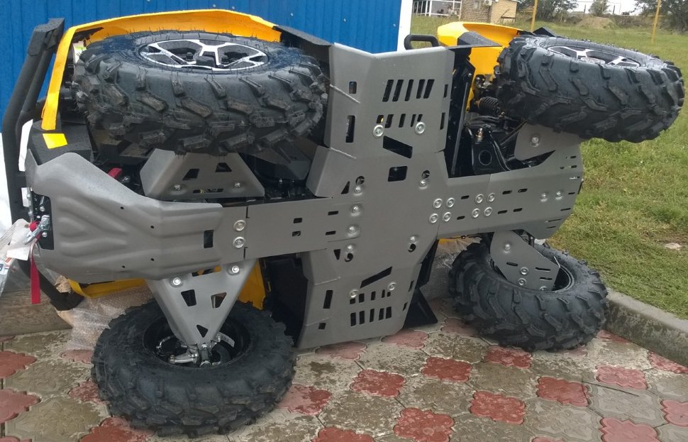 Комплект защиты (днище, пороги, рычаги, радиатор, шрусы) для двухместного квадроцикла от 2017 до 2018 года выпуска из алюминия толщиной 4 мм.