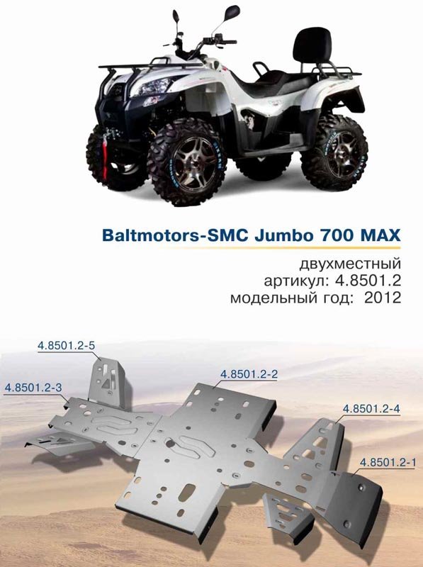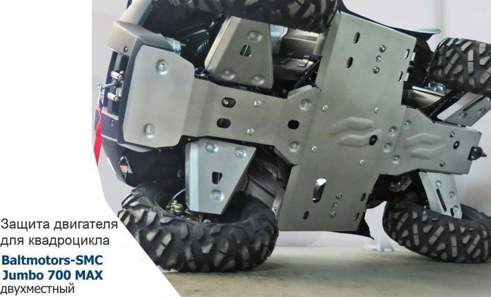 Комплект защиты (днище, пороги, рычаги, радиатор) для двухместного квадроцикла Baltmotors-SMC Jumbo 700 MAX (от 2012 года выпуска) из алюминия толщиной 4 мм.