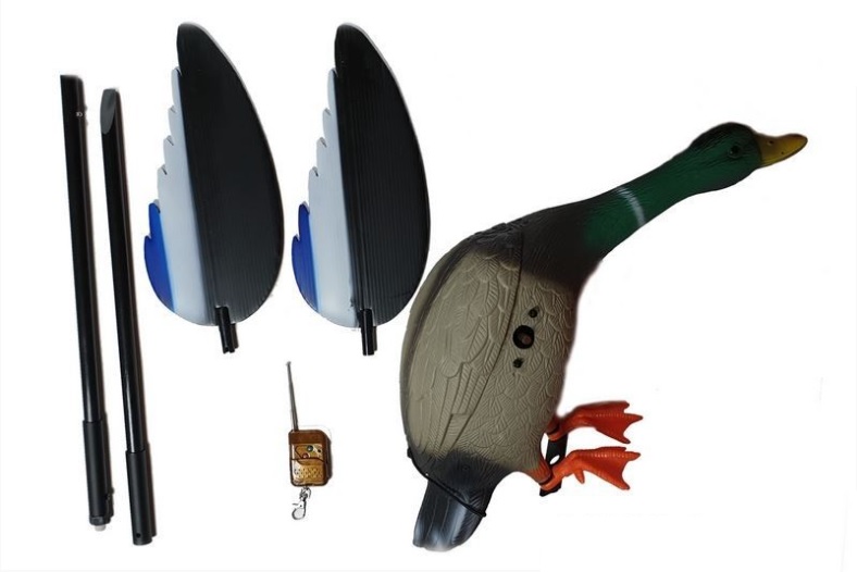 Чучело сделано в натуральный размер живой утки в садящейся позе. Текстура махокрыла сделана очень качественно, поэтому даже с небольшого расстояния его вполне легко можно спутать с живой птицей. Основной элемент, которым чучело привлекает уток – это вращение крыльев, за счет чего его можно увидеть с дальних расстояний – проверенно хорошо работает! Управление чучелом осуществляется с помощью пульта (идет в комплекте), с помощью которого можно организовывать продуманные засады на расстоянии до 50 м, вовремя включая и выключая махокрыл для более живой имитации поведения птицы. В комплект также идет высокий штатив, выполненный из композитного прочного стекловолокна, поэтому электронную утку можно использовать в зарослях, кустах, болотах, а также на озере. Шест чучела представляет собой наборные модули, благодаря чему можно менять высоту – от 60 до 146 см. Моторчик крыльев и клеммы для питания находятся в полом теле, которые расположены в открывающемся отсеке спины. Также к преимуществам стоит отнести бесшумную работу механизма взмаха – никакого скрипа, только легкий шелест.