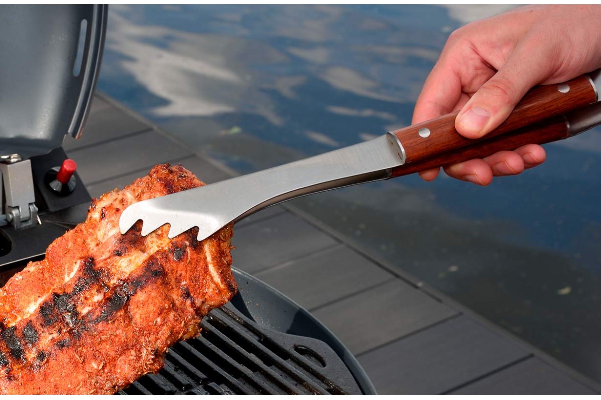 Недорогой и функциональный набор аксессуаров для гриля из 2 предметов. Это минимальный набор аксессуаров, который позволяет решить вопросы качественного приготовления гриль-блюд. Материал рабочей части инструмента – это шлифованная нержавеющая листовая сталь толщиной 1,2 мм. Продуманные конструктивные решения (особенно форма щипцов), удобные и приятные на ощупь ручки из плотных пород дерева — все это оставляет впечатление надежности, качества и долговечности.
