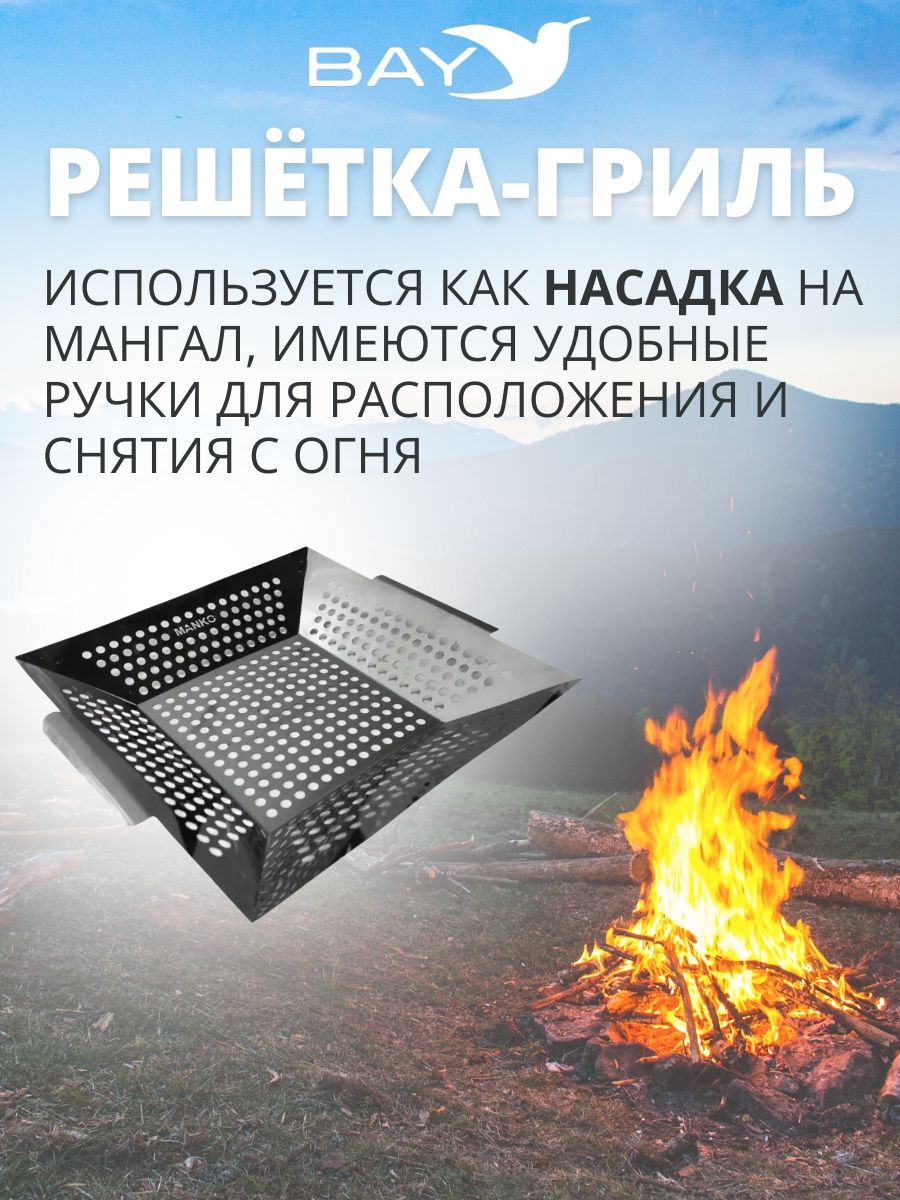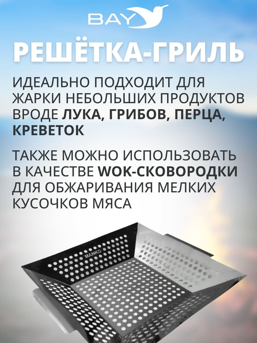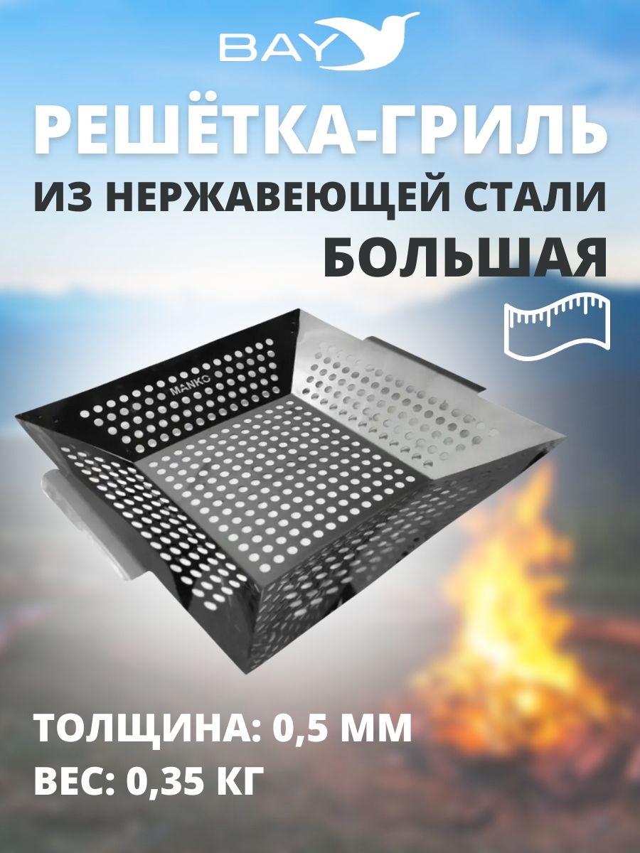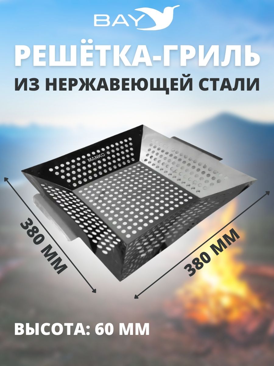 Решетка для гриля из нержавейки большая 38*38 см, с двумя ручками. Решетка гриль для мангала от компании MANKO - это специально разработанная решетка для приготовления различных морепродуктов, для рыбы и овощей на гриле, а так же для обжарки мяса кусочками на мангале. Она изготовлена из нержавеющей стали 0.5 мм, которая обеспечивает высокую термическую стойкость и защиту от коррозии. Оптимальная рабочая глубина 5.5 см. Решетка на мангал имеет уникальную форму вок, обеспечивающую удобное приготовление не только рыбы но и креветок на гриле, а также овощей. Так же дно можно использовать как сковорода для мангала. Удобные глубокие ручки решетки так же служат для удерживания решетки на мангале, что бы было удобно перемешивать, а ребра и отверстия на поверхности дают возможность равномерно обжаривать, запекать продукты. Важным преимуществом решетки-гриль является возможность сохранения вкуса и аромата морепродуктов, что делает их более аппетитными. Также, данные решетки гриль уменьшают риск прилипания морепродуктов к поверхности в отличии от классической решетки барбекю, что упрощает процесс приготовления и сокращает время очистки. В целом, решетки для гриля для рыбы - это незаменимые атрибуты любого гриллинга на открытом воздухе, позволяющие получить максимальный вкус и аромат морепродуктов. Они обеспечивают удобство в использовании. Гриль решетка от компании Манко, производство в Беларуси.