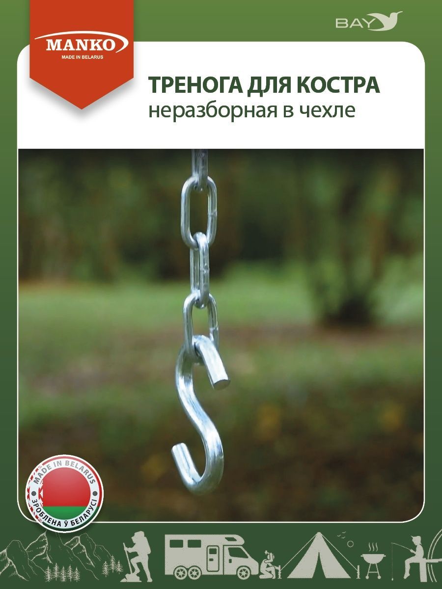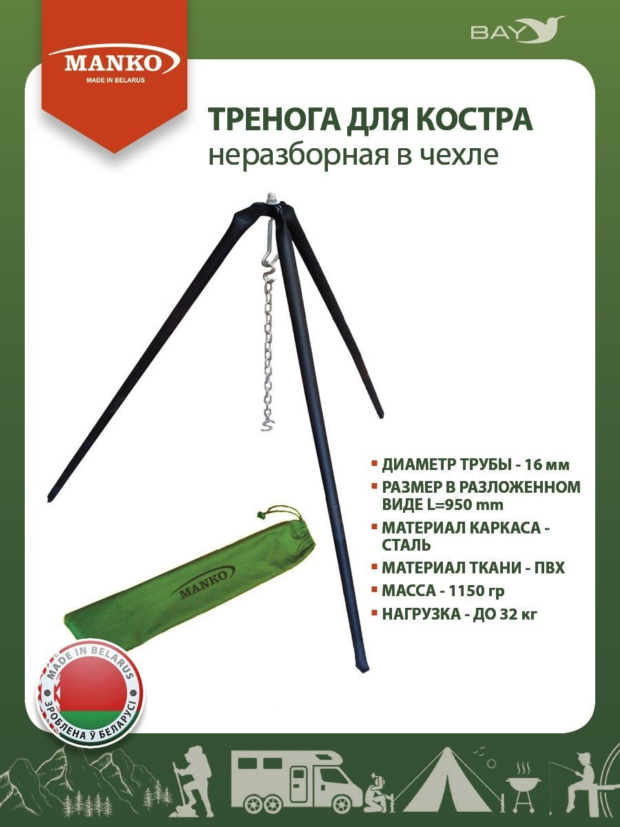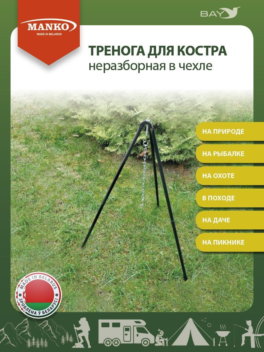 Тренога для костра разборная с фиксатором в чехле / тренога не разборная (второй вариант) и тренога "Бюджет" сталь 0,7мм (третий вариант). Тренога костровая от белорусского производителя MANKO! Изготовлена из стальной трубы диаметром 16 мм. Максимальная нагрузка -32 кг. В комплект входит тренога, крючок, чехол для хранения и транспортировки. Незаменимая вещь на природе, для приготовления пищи на костре в котелке, в казане. Можно использовать в походе, на рыбалке, на охоте, на пикнике. Благодаря своим не большим размерам в сложенном виде 57*10 см, с лёгкостью влезет вам в рюкзак. Высота в разложенном виде 95см. Аксессуар для рыбака, охотника, туриста. порадуй себя на пикнике, в походе, на отдыхе качественно приготовленной едой. Удобно, просто, компактно для туристов, любителей отдыха на природе. подарок друзьям туристам, рыбакам, Новый год! 23 февраля! День рождение!