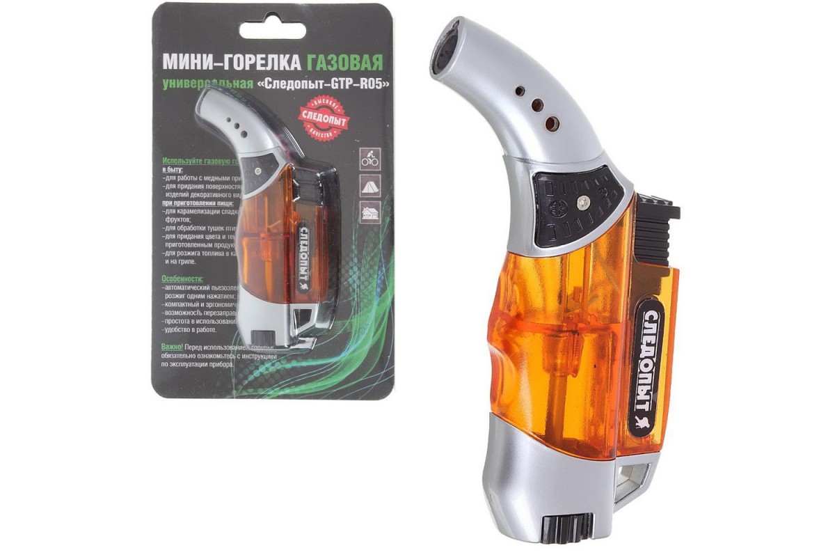 Имеет обширную сферу применения не только в туристических походах, но и в повседневной жизни. А именно в приготовлении пищи, для работы с медными припоями, для придания поверхностям деревянных изделий декоративного вида, для карамелизации сладких десертов, фруктов, для обработки тушек птиц и животных, для придания цвета и текстуры приготовленным продуктам, для розжига топлива в каминах, мангалах и на гриле. Розжигается всего одним нажатием – пьезоэлектрическим способом. Имеет возможность перезаправки газом. Предельно проста и удобна в работе. Компактного размера. Габаритные размеры – 105 х 20 х 55 мм. Вес – 68 г.