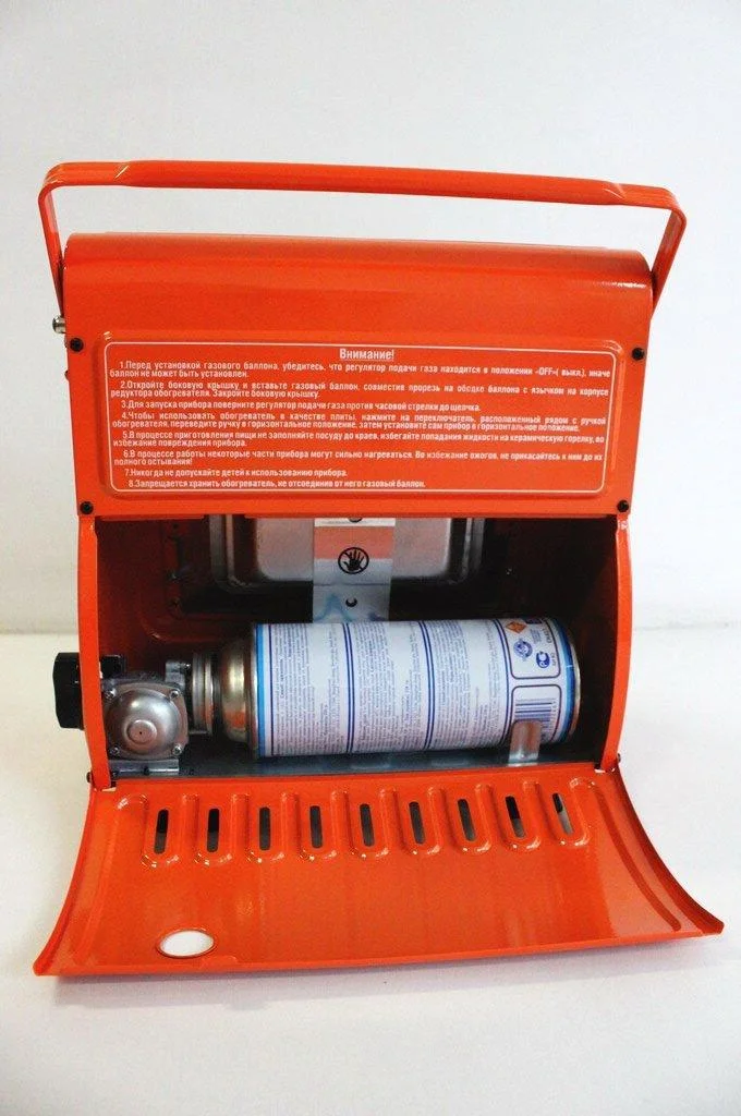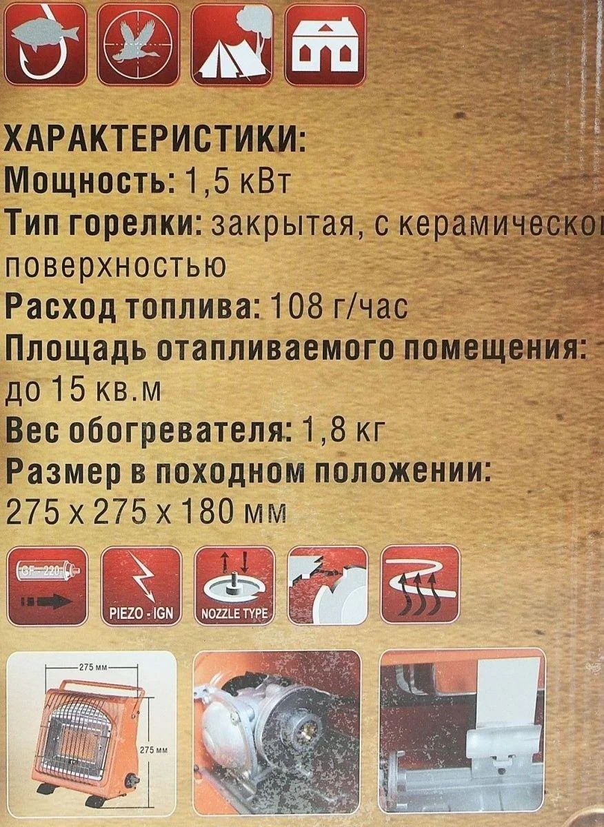 Площадь отапливаемого помещения до 15 кв.м, можно использовать для приготовления пищи. Для питания обогревателя используются газовые смеси в баллонах с клапаном нажимного типа и цанговым захватом (220 г).