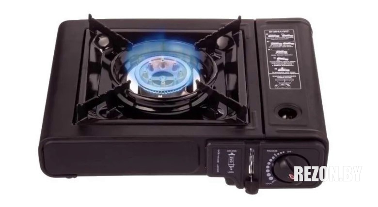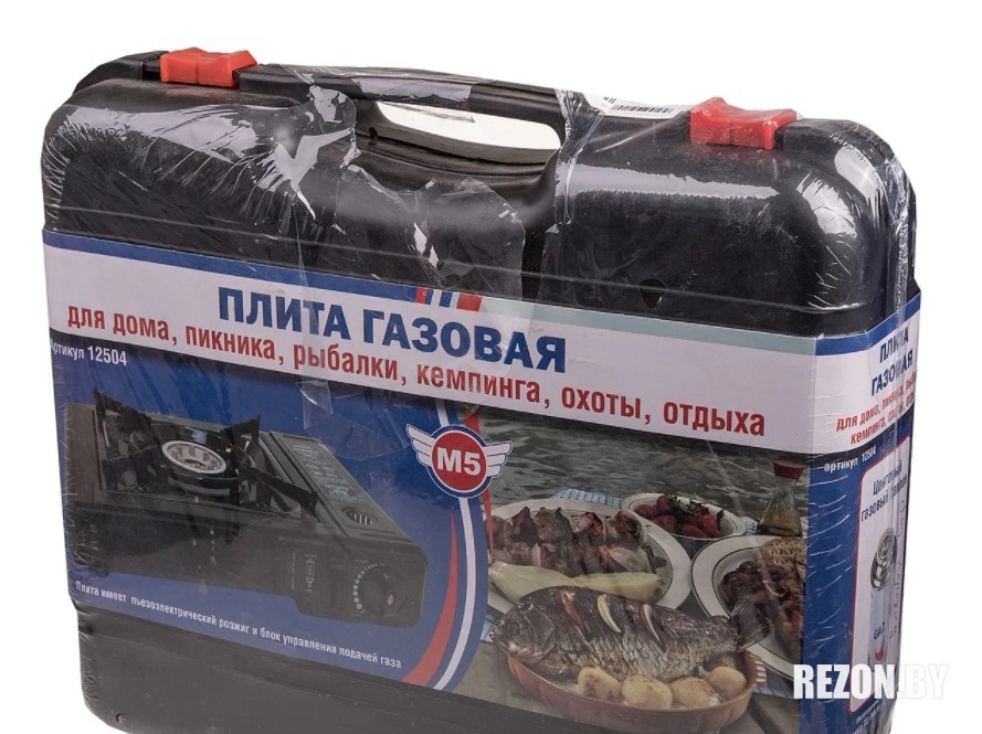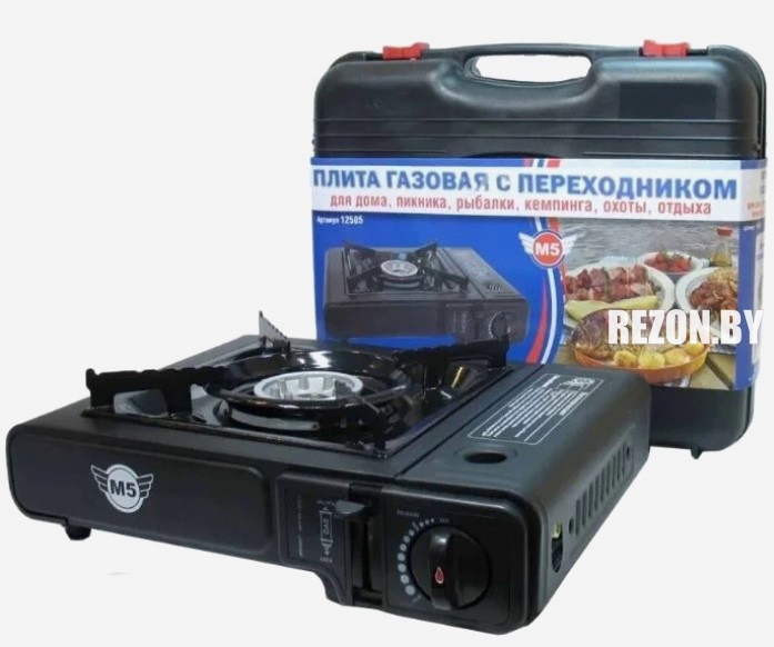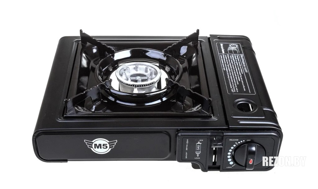 Плита М5 долговечна, не занимает много места в багажнике автомобиля при транспортировке. Отсек для установки баллона оснащен вентиляционными отверстиями. На передней панели газового оборудования находится рычаг фиксации газового баллона, а так же ручка регулировки силы пламя.