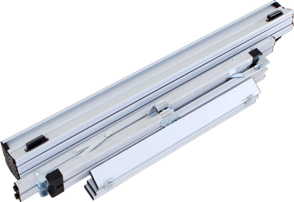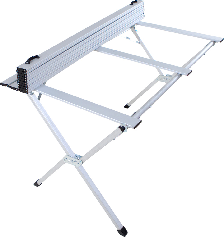 Это большой алюминиевый стол, складывающийся в тубус. Его размеры –высота, ширина и глубина составляют по 70 / 120 / 70 см. Надёжная конструкция позволяет столу справляться с нагрузками до 40 кг за счёт 3х поперечных усилителей, при этом вес его всего 5.5 кг, а размеры в упаковке 18х12х120.