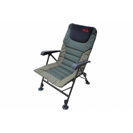 Удобное кресло с подлокотниками незаменимый атрибут не только заядлого карпятника, но и любого рыбака, любящего проводить время у воды с комфортом. Кресло выполнено из ткани полиэстер Oxford 600D. Спинка покрыта неопреном. Каждая ножка регулируется по высоте независимо от других, что позволяет подстроить кресло под любые неровности.