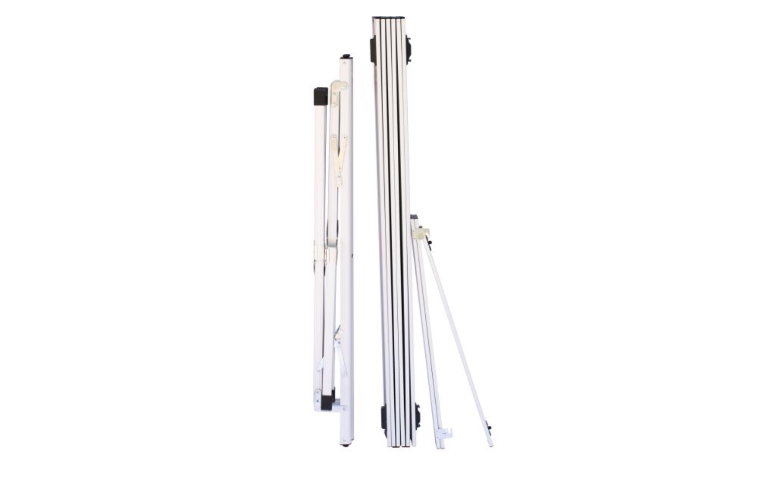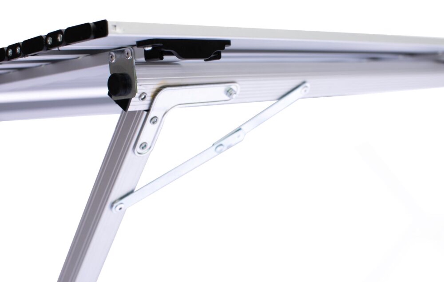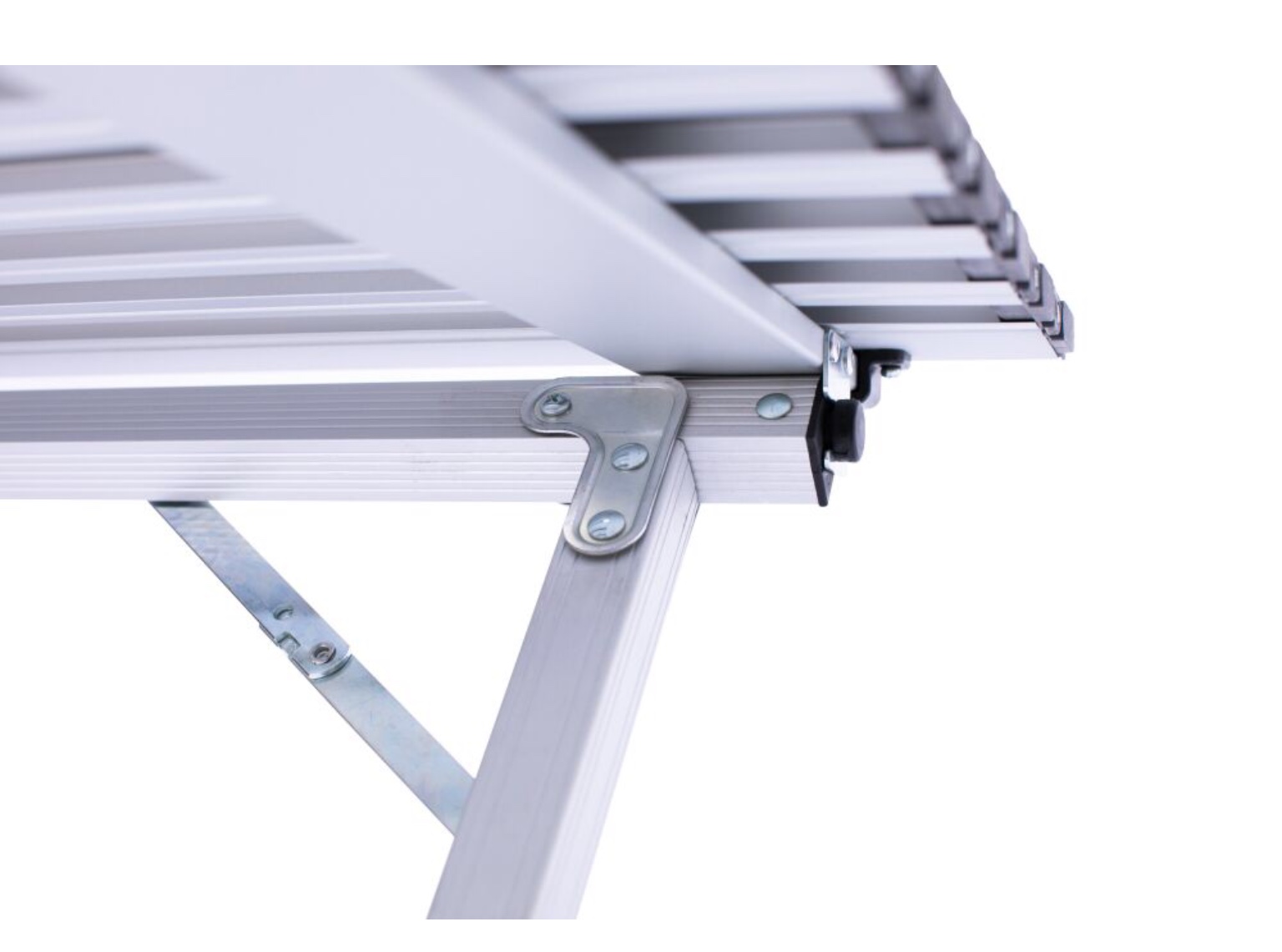Складывающаяся «гармошкой» столешница и складной каркас столика выполнены из легкого и прочного алюминия .