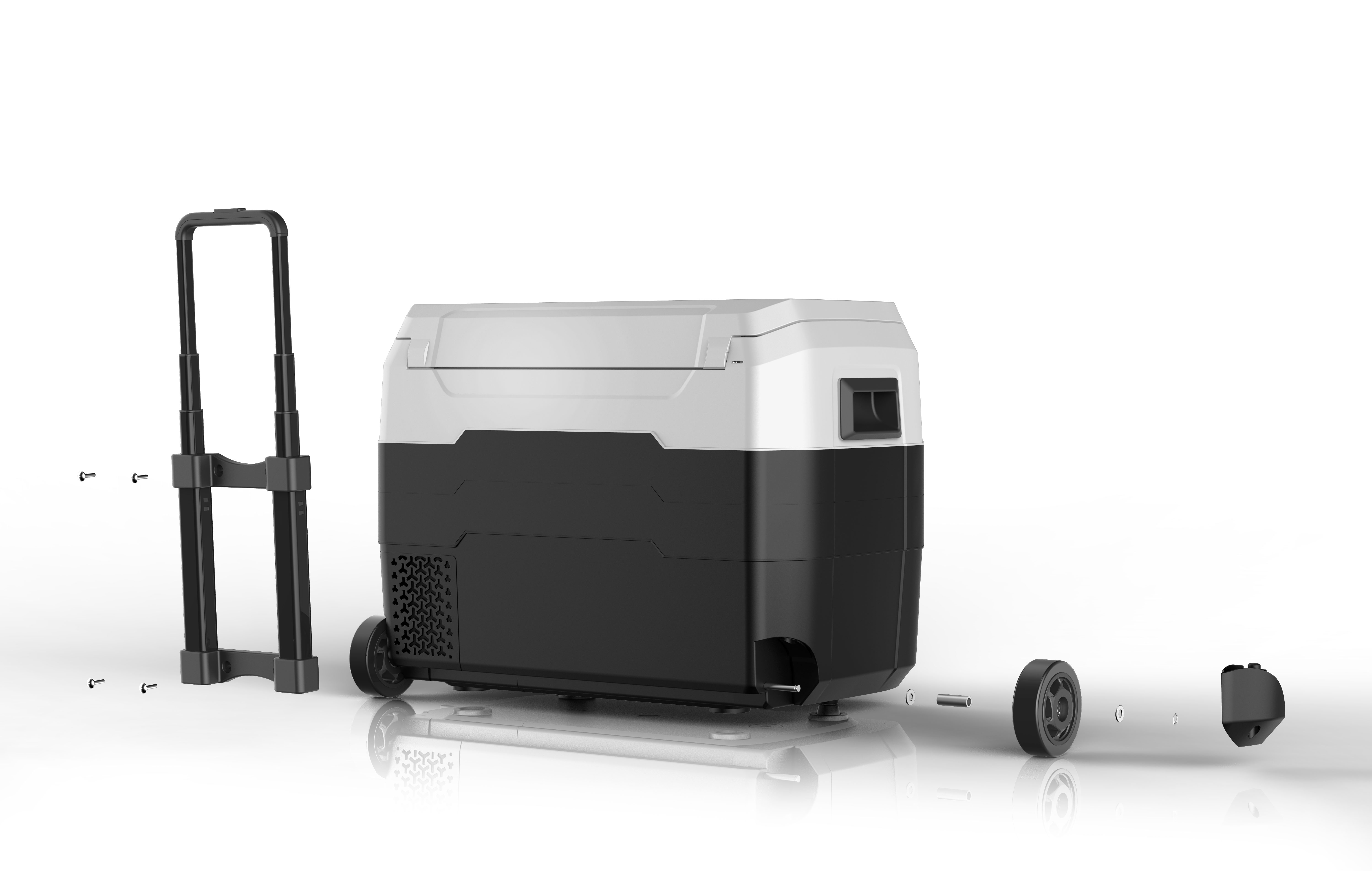 Это удобный в использовании и перемещении автохолодильник. Выдвижная ручка и колесики, размещенные с одной из сторон корпуса устройства, облегчают передвижение прибора; при этом спрятанная ручка не мешает пользователю, когда она не нужна, а наличие опор с противоположной от колес стороны корпуса устройства обеспечивает прочную фиксацию агрегата.