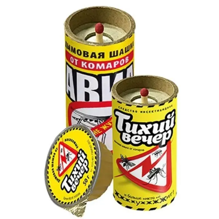 Дымовая шашка «Тихий Вечер АВИА» предназначена для уничтожения комаров, а также других насекомых и паразитов (гнус, мошкара, слепни, клопы, тараканы, моль, блохи, муравьи, мухи, крысиные клещи и т.д.).
