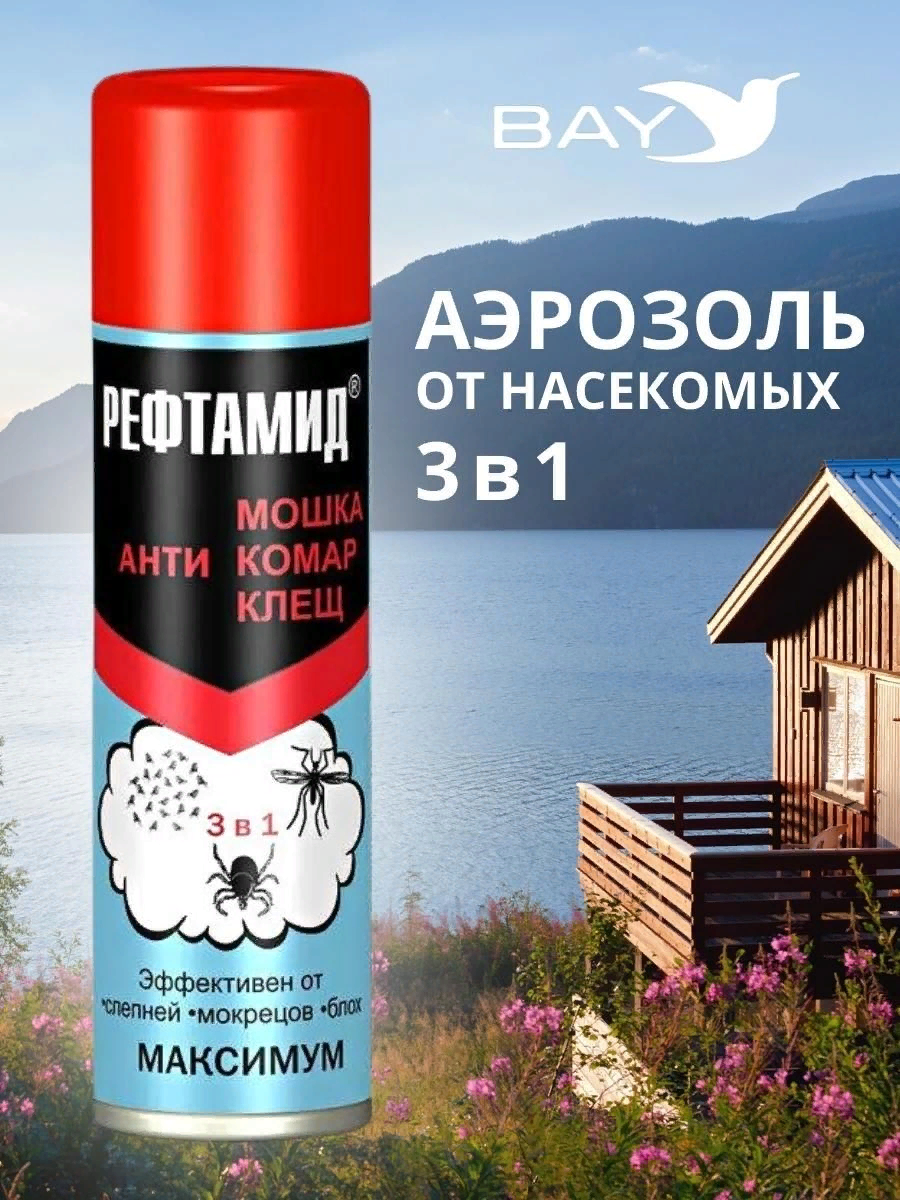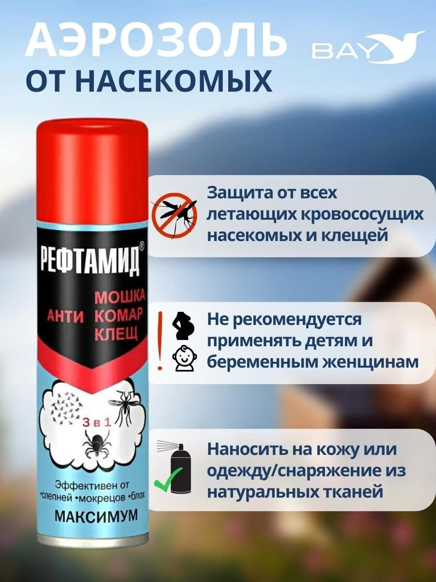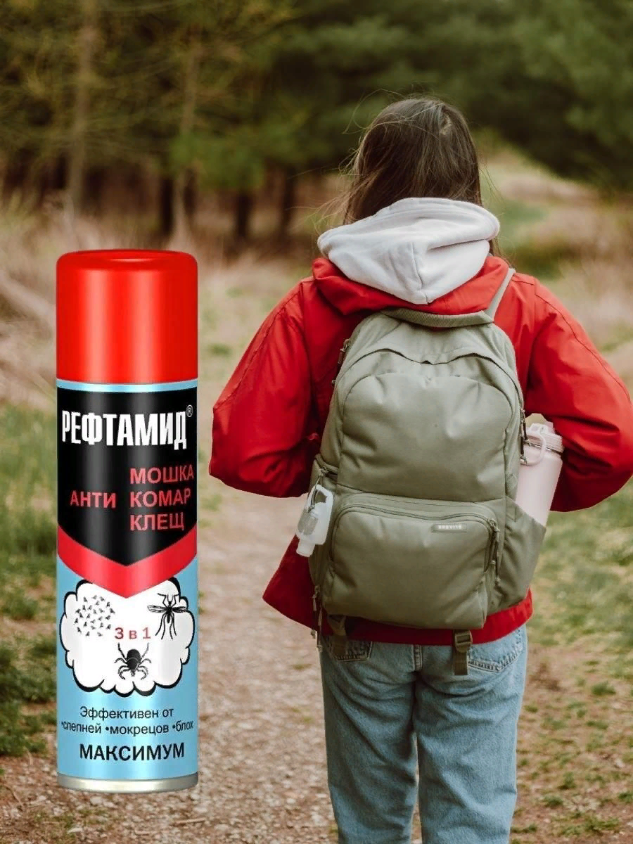 Рефтамид максимум 3 в 1 - Универсальный спрей для защиты людей от нападения комаров, мошки, лесных и таёжных клещей. Средство содержит высокоэффективный действующий компонент, сохраняет своё действие в течение 4-5 часов. Аэрозоль наносится как на одежду, так и открытые участки кожи. Способ применения: Перед применением баллон встряхнуть. Распылить средство на ладонь и нанести, не втирая, на открытые части тела. Одежду обрабатывать до легкого увлажнения с расстояния 20 - 25 см. Для походов, туризма, отдыха на природе. Комфорт безопасность на природе.