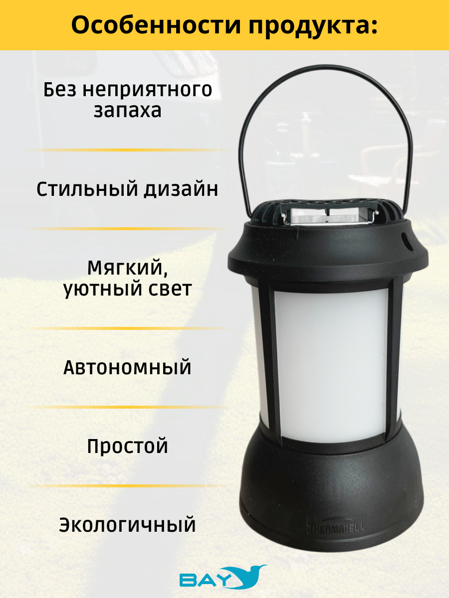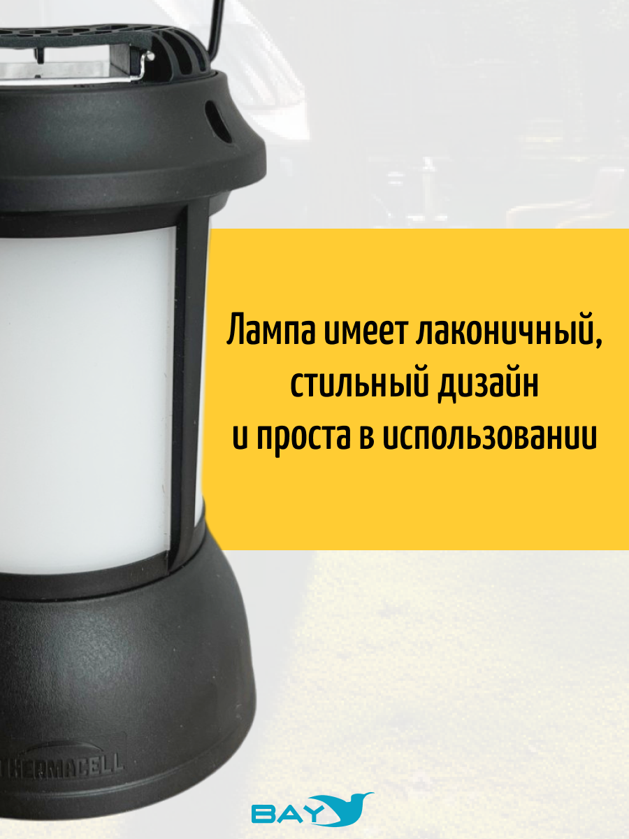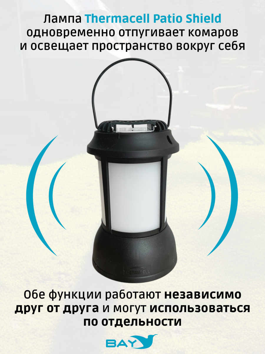 Лампа Thermacell Patio Shield одновременно отпугивает комаров и освещает пространство вокруг себя. Обе функции работают независимо друг от друга и могут использоваться по отдельности. Лампа имеет лаконичный, стильный дизайн и проста в использовании.