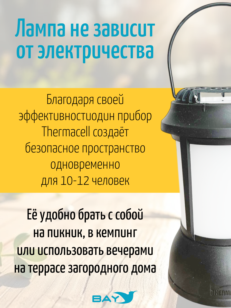 Как и все приборы Thermacell, модель Patio Shield защищает от комаров, работая по принципу фумигации: газовый картридж нагревает пластину с репеллентом, репеллент испаряется и накапливается в воздухе, создавая защитный купол площадью до 20 кв. м. Лампа не зависит от электричества, её удобно брать с собой на пикник, в кемпинг или использовать вечерами на террасе загородного дома. Благодаря своей эффективности один прибор Thermacell создаёт безопасное пространство одновременно для 10-12 человек.