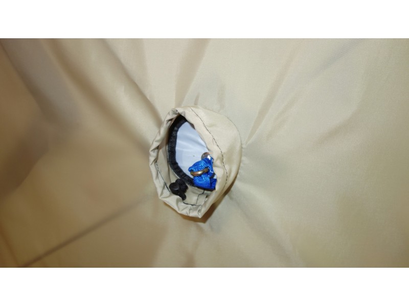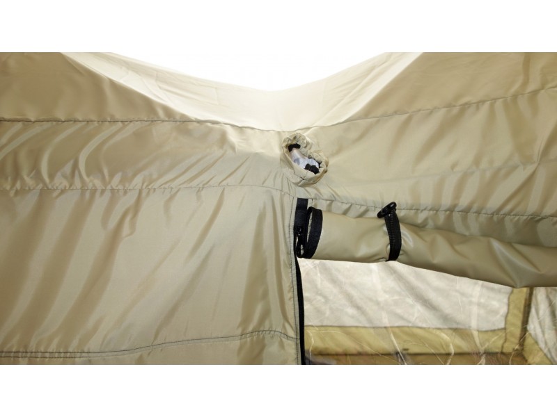 В местах, где находятся оттяжки и расположено окно, имеются затяжные шнурки с фиксаторами. У внутренних стоек вверху предусмотрены карманы под оттяжки. Таким образом, Вы можете максимально закрепить Ваше укрытие, используя дополнительно растяжки и колышки.