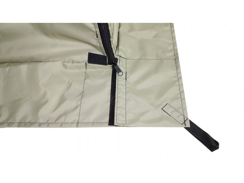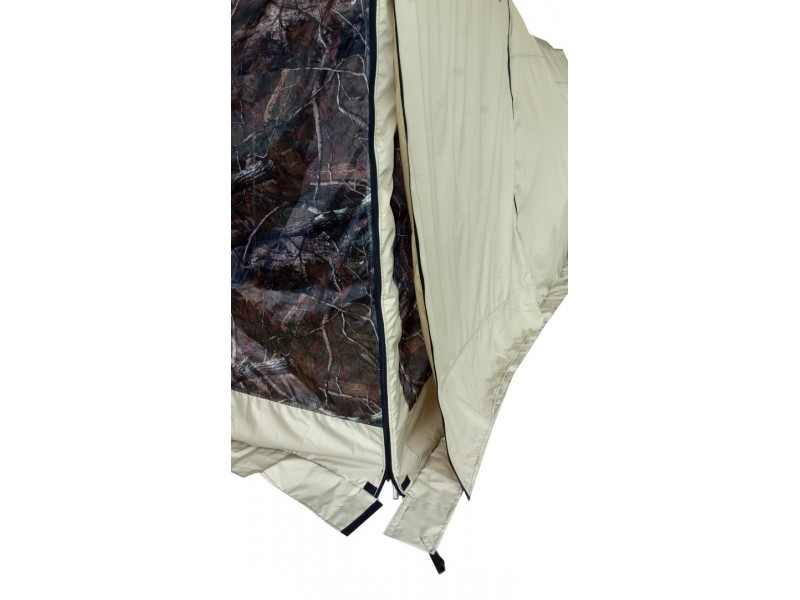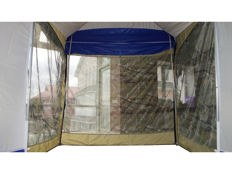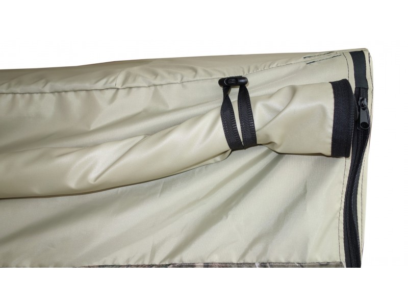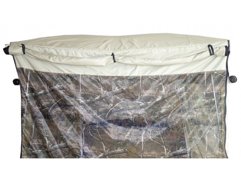 Изготавливается Навес из материала Оксфорд с плотностью плетения 240, полиуретановой пропиткой (PU 2000) и москитной сеткой на молнии. Поверх москитных сеток предусмотрены защитные клапаны от дождя. При необходимости их можно закрыть с помощью молний, либо закрепить в верхней части с помощью петель и пуговиц-клевант.