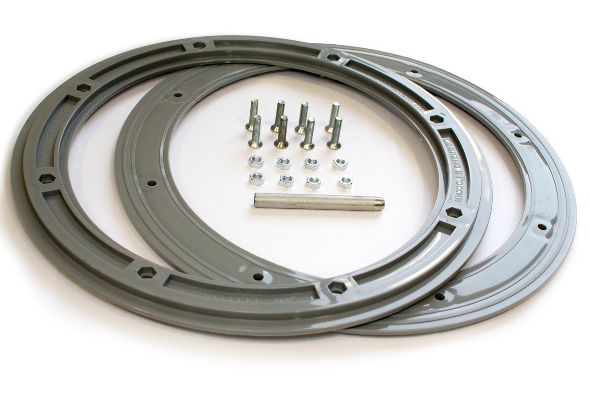 ✔Фланцы представляют собой два литых диска из морозостойкого полипропилена с встречно смыкающимися плоскими поверхностями, на которых расположены кольцевые выступы, фиксирующие в сборе материал пола и надежно герметизирующие вырез под лунку. Нижний фланец имеет выступ, который образует кольцевой бортик с ребрами жесткости.