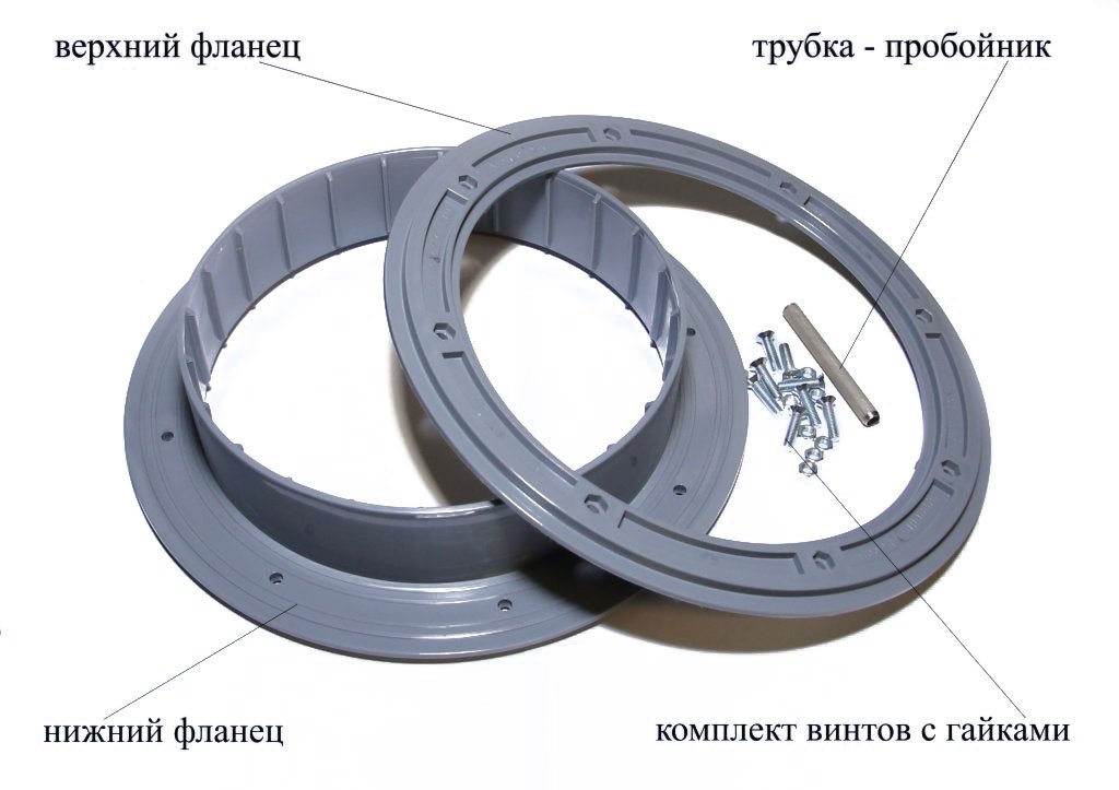 ✔Фланцы представляют собой два литых диска из морозостойкого полипропилена с встречно смыкающимися плоскими поверхностями, на которых расположены кольцевые выступы, фиксирующие в сборе материал пола и надежно герметизирующие вырез под лунку. Нижний фланец имеет выступ, который образует кольцевой бортик с ребрами жесткости.