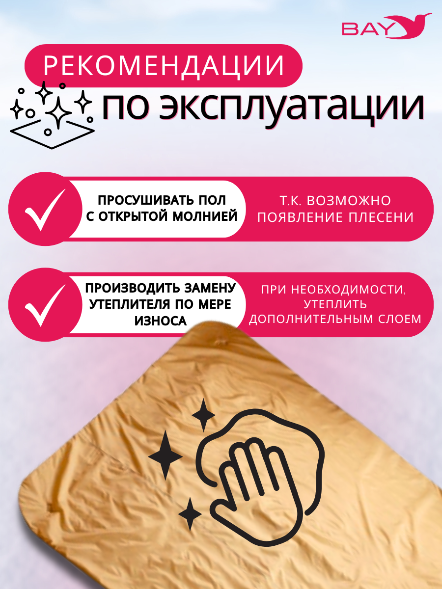 Пол утепленный ЛОТОС Куб 3 (210х210) ПУ1000 изготовлен из теплоизоляционного материала с металлизированным покрытием (Пенофол, тип А, толщина 8 мм), вложенного в герметичный чехол из прочной ткани Оксфорд 200Д ПУ1000. Поскольку герметичный чехол пола препятствует просыханию влаги, если она тем или иным образом просочится внутрь, в одной из торцевых частей чехла вшита молния, позволяющая открывать доступ внутрь чехла. После эксплуатации пола рекомендуется просушивать его с открытой молнией. Оставшаяся внутри пола влага может быть причиной распространения плесени, вредной для здоровья. Вшитая в чехол пола молния позволяет производить замену утеплителя по мере его износа, а также, при необходимости, утеплять пол дополнительным слоем утеплителя.
