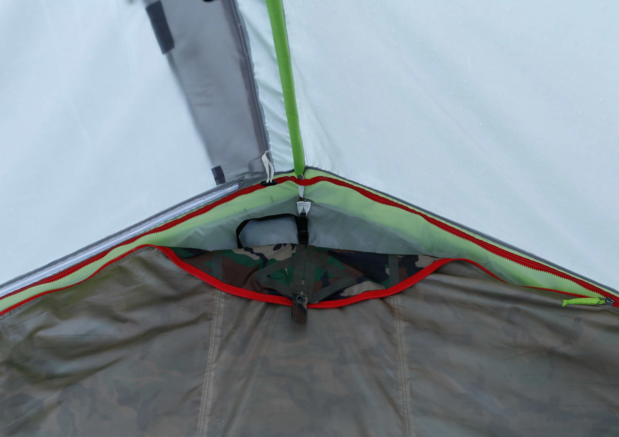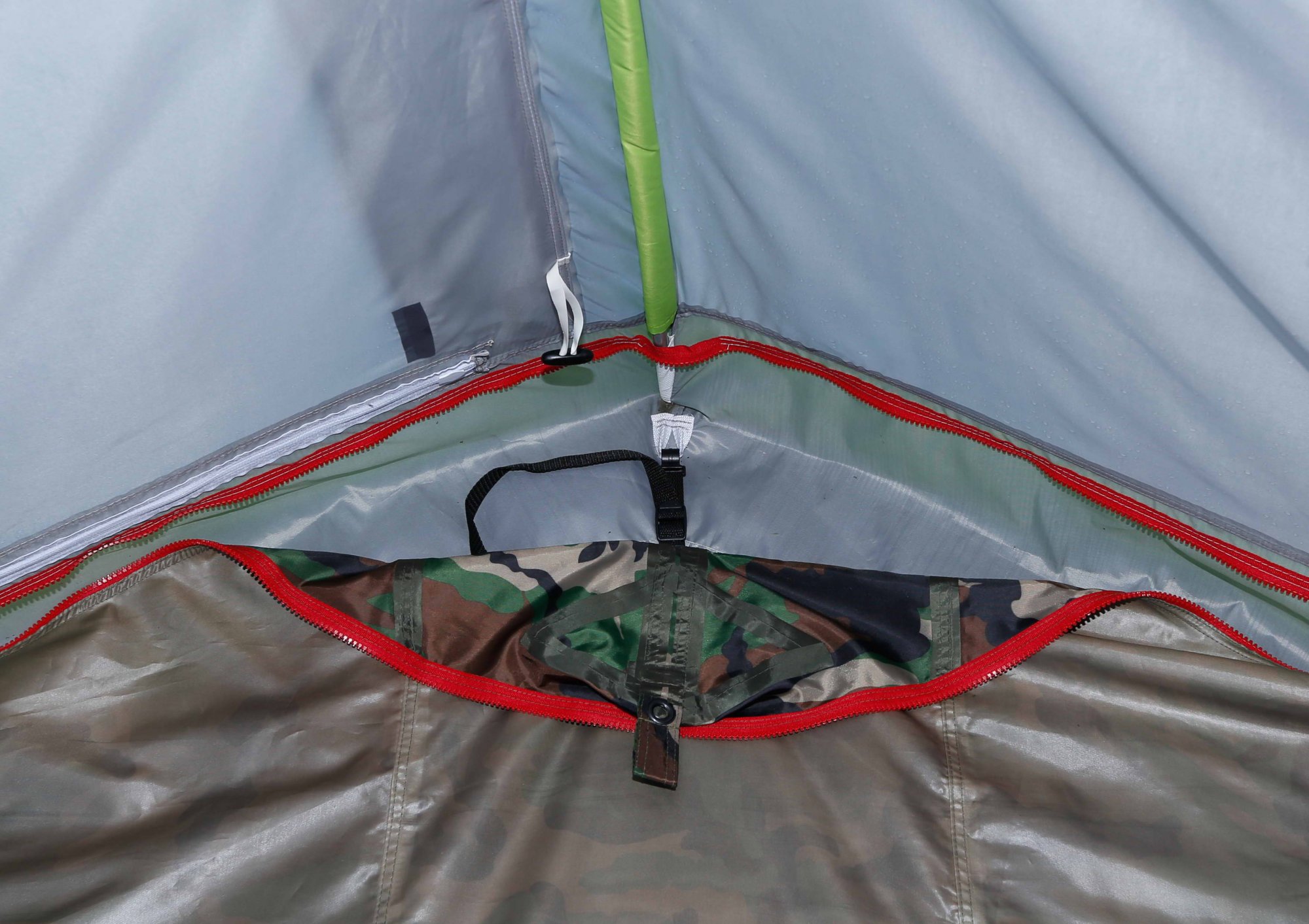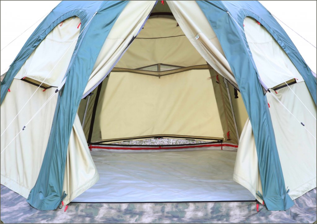 В пристегнутом состоянии пол образует форму «корыта» с бортиком, герметично изолируя внутреннее пространство в палатке. Такая конструкция дна создает надежное препятствие от проникновения внутрь палатки насекомых, а также защитит вещи и снаряжение от намокания при непредвиденном затекании воды под палатку, например при сильном ливне.