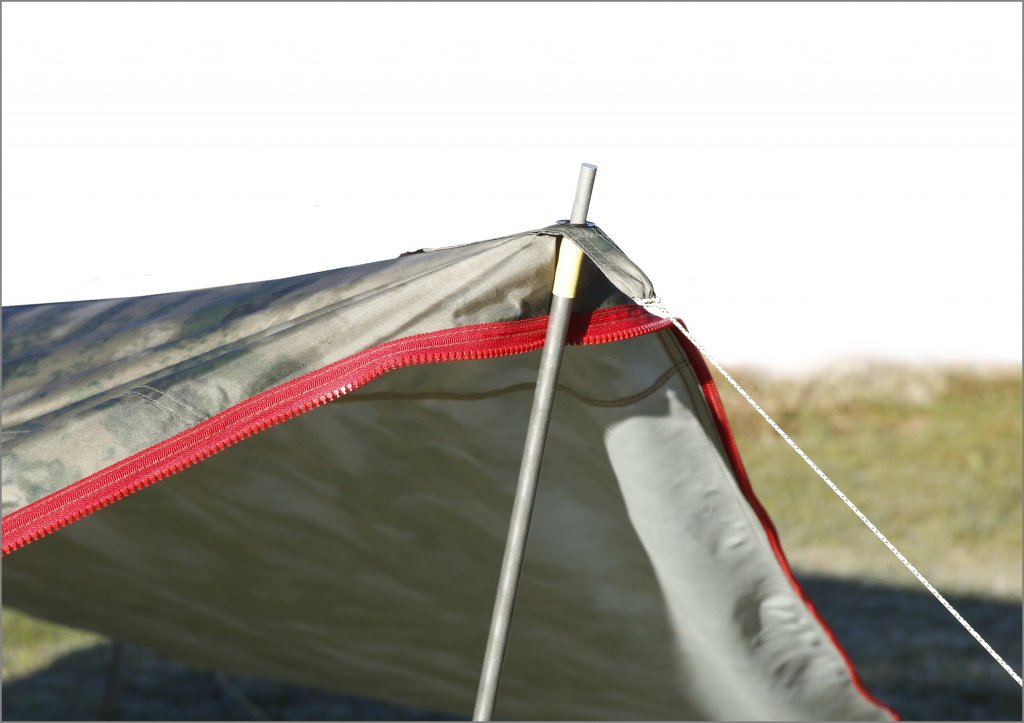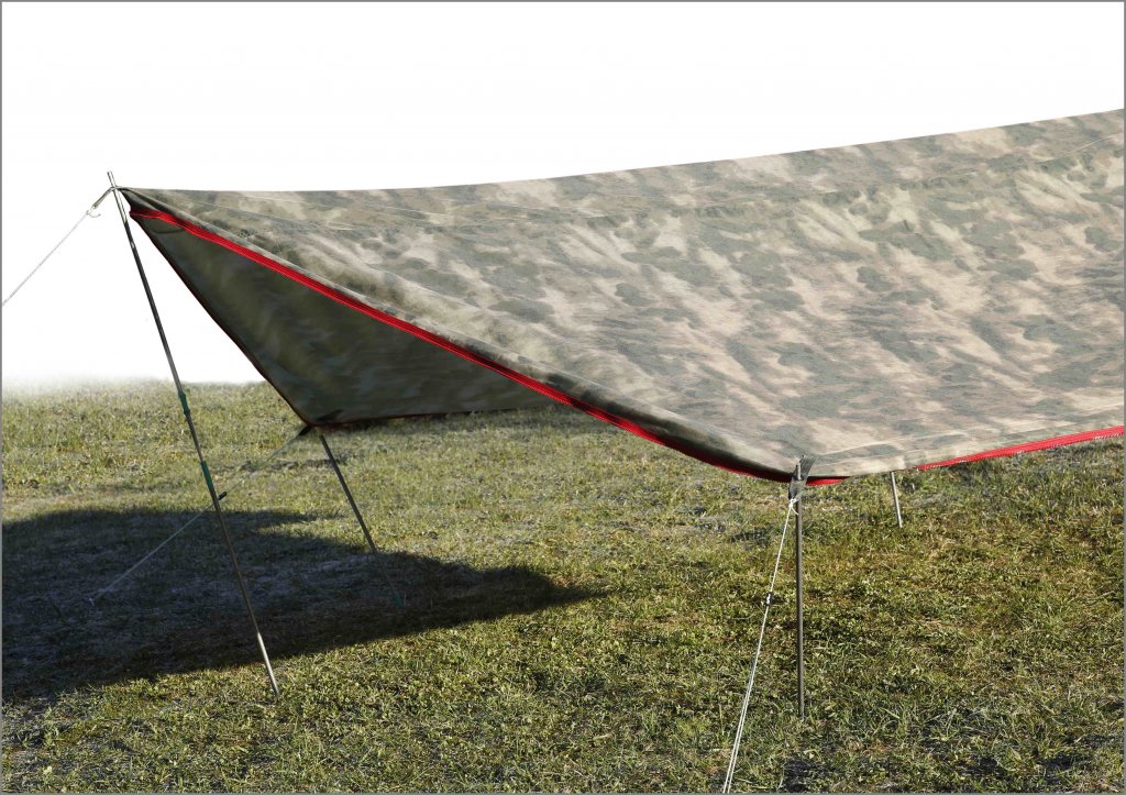 3) Установка тента на две распорки с фиксацией остальных углов тента непосредственно к почве, позволяет сформировать эффективное для защиты от дождя и ветра укрытие, закрытое по бокам.