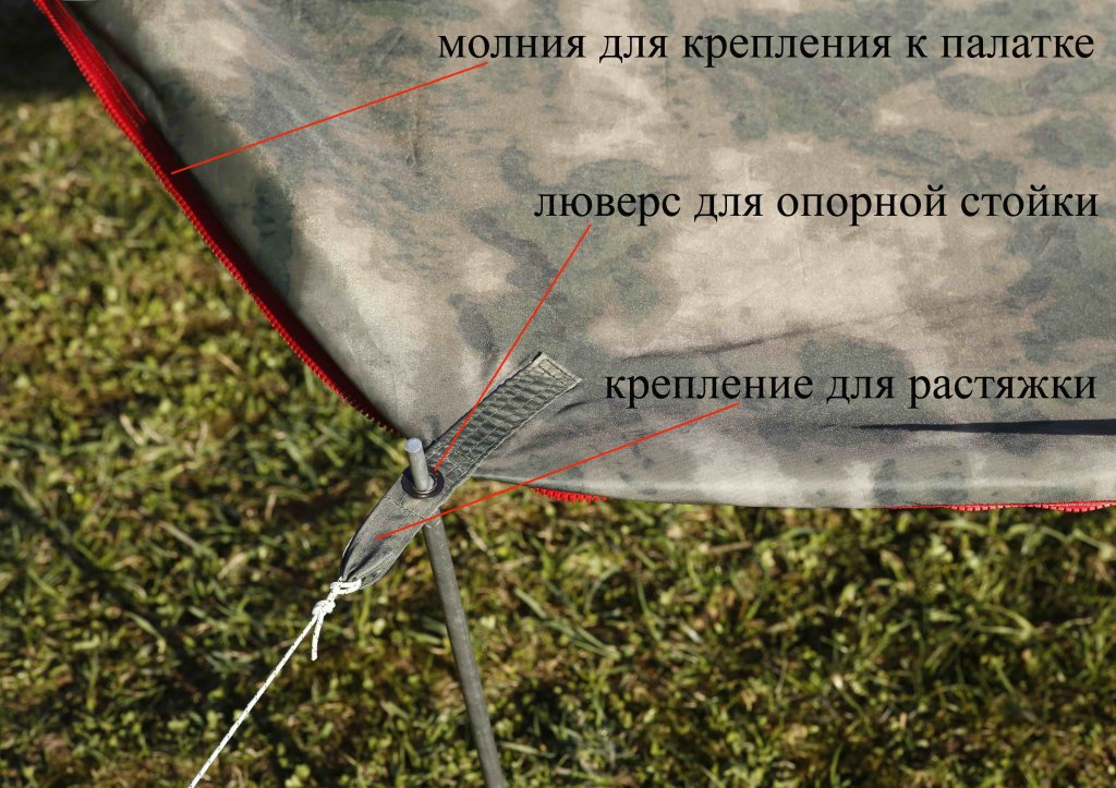 Пол застилается в днище палатки цветной стороной (поверхность с кмф рисунком) направленной вниз, в сторону почвы, а светлой стороной (светло-серая) - вверх. На светлую сторону ткани нанесено влагозащитное полиуретановое покрытие, которое должно быть направлено внутрь палатки.