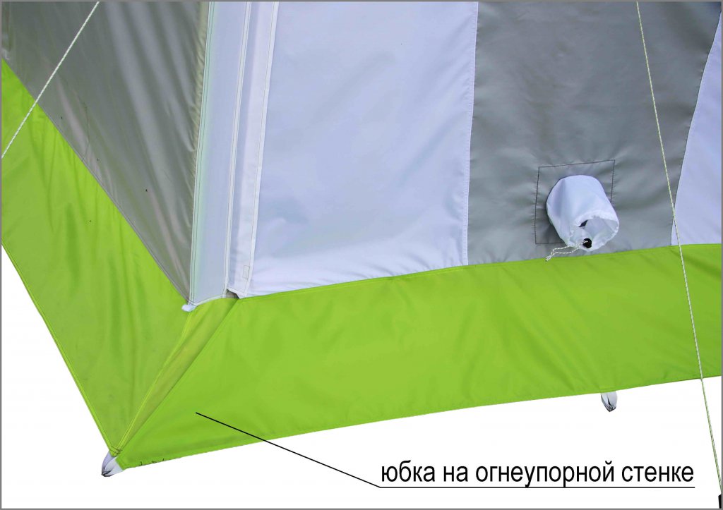 Нижняя часть огнеупорной стенки снабжена защитной юбкой с креплениями для ввертышей (колышков). Юбка на стенке полностью дублирует юбку на палатке. Наличие защитной юбки на стенке, позволяет присыпать ее снегом или землей, тем самым защищая палатку от ветра и влаги.