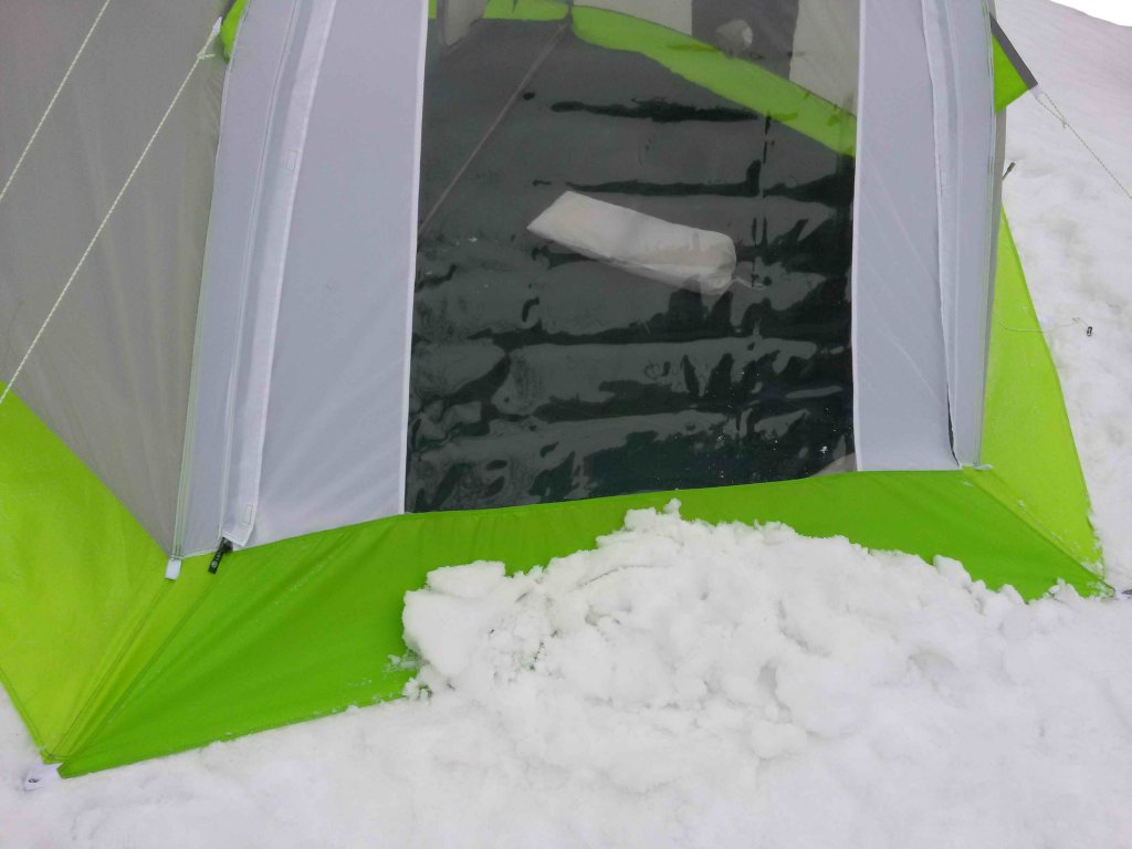 ✔Нижняя часть прозрачной стенки снабжена защитной юбкой с креплениями для ввертышей (колышков). Юбка стенки полностью дублирует юбку палатки. Наличие защитной юбки на стенке, позволяет присыпать ее снегом или землей, тем самым защищая палатку от ветра и влаги.