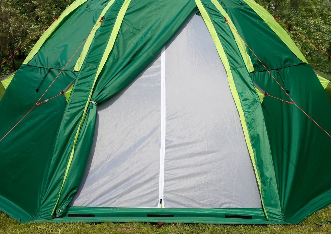 - Тент установлен. Для хорошей натяжки стенок внутреннего тента закрепите палатку с хорошим натяжением с внешней стороны растяжками и колышками по периметру юбки.