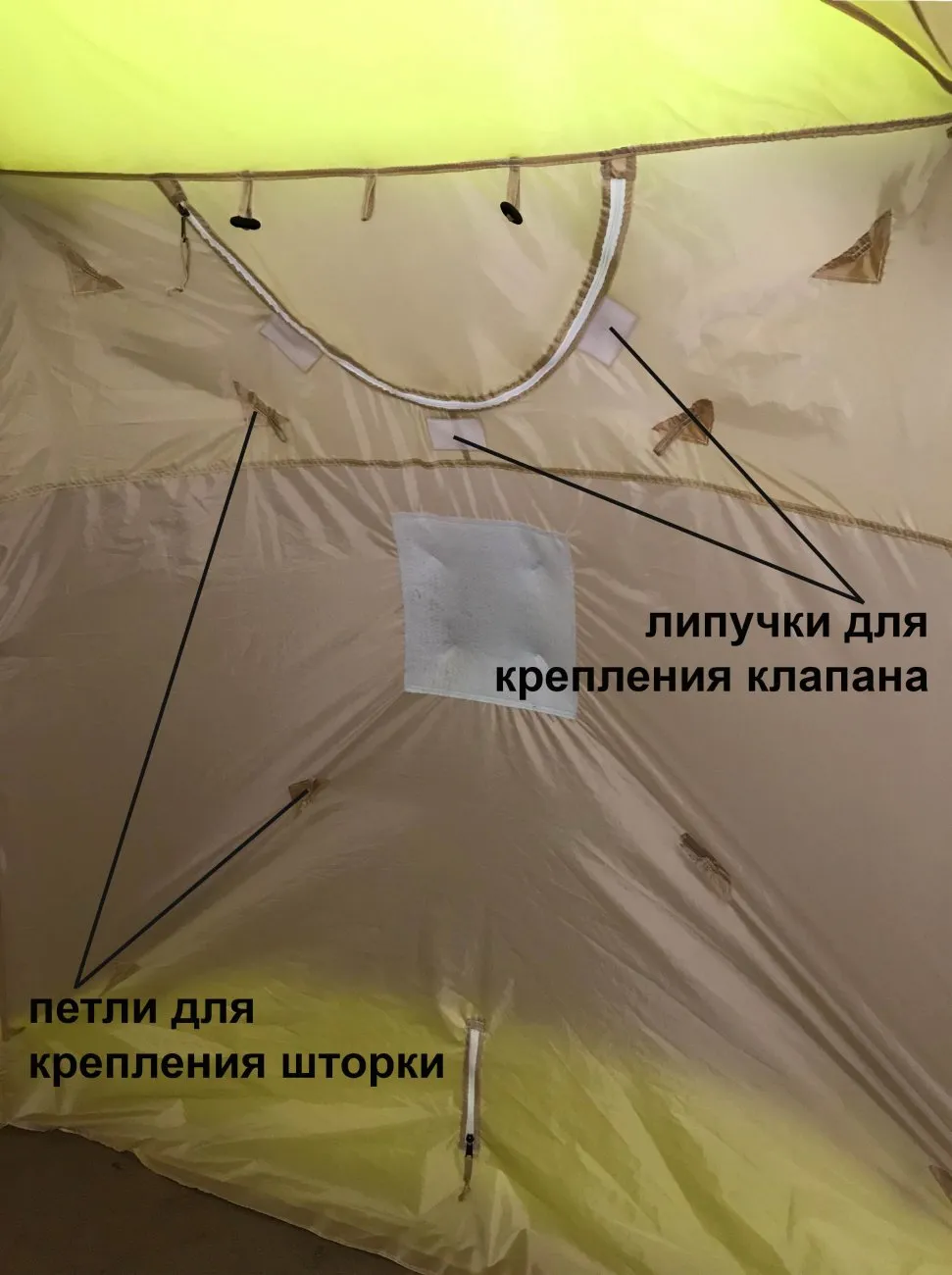 В одном из оконных проемов внутреннего тента встроена система крепления огнеупорного клапана с защитной шторкой (опция, приобретается отдельно), предназначенного для фиксации и вывода вытяжной трубы дровяной печи и прочих обогревательных приборов.
