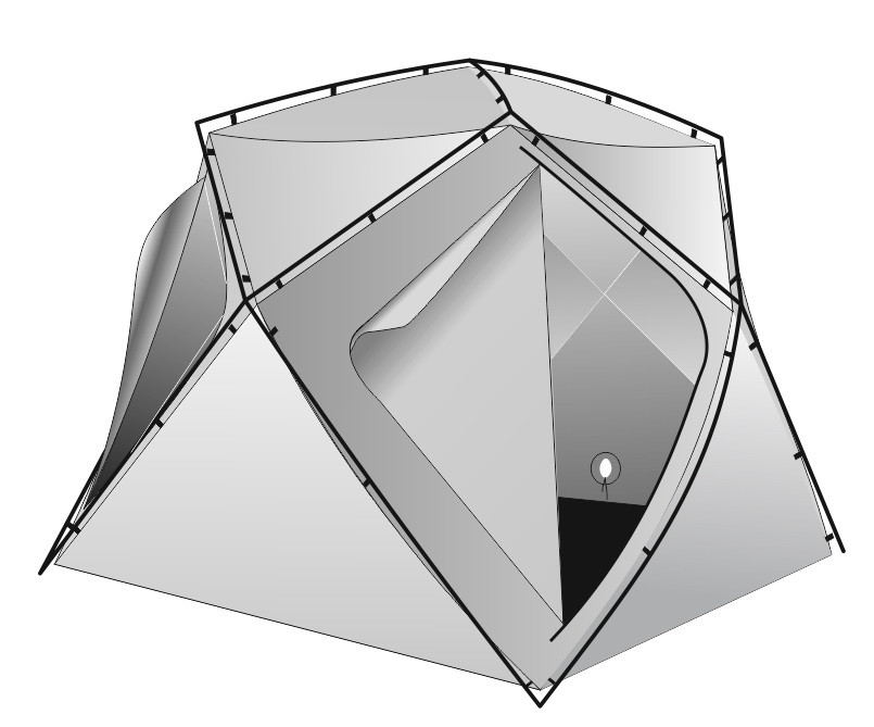 Форма тента полностью повторяет форму палатки и дублирует все ее необходимые функциональные элементы: вытяжной клапан, приточный клапан, клапан для вытяжной трубы (устанавливается в окошко), окошки (2 шт), внутреннюю юбку и две входные двери. Для удобства пользователей на стенках тента предусмотрены петли для подвешивания различных предметов, а под потолком крепится подвесная полочка (опция) для просушивания вещей. На стенках тента, в средней части расположены кармашки для мелких предметов и удильников (2 сдвоенных кармашка); в нижней части расположены большие карманы для габаритных вещей (2 сдвоенных кармана).