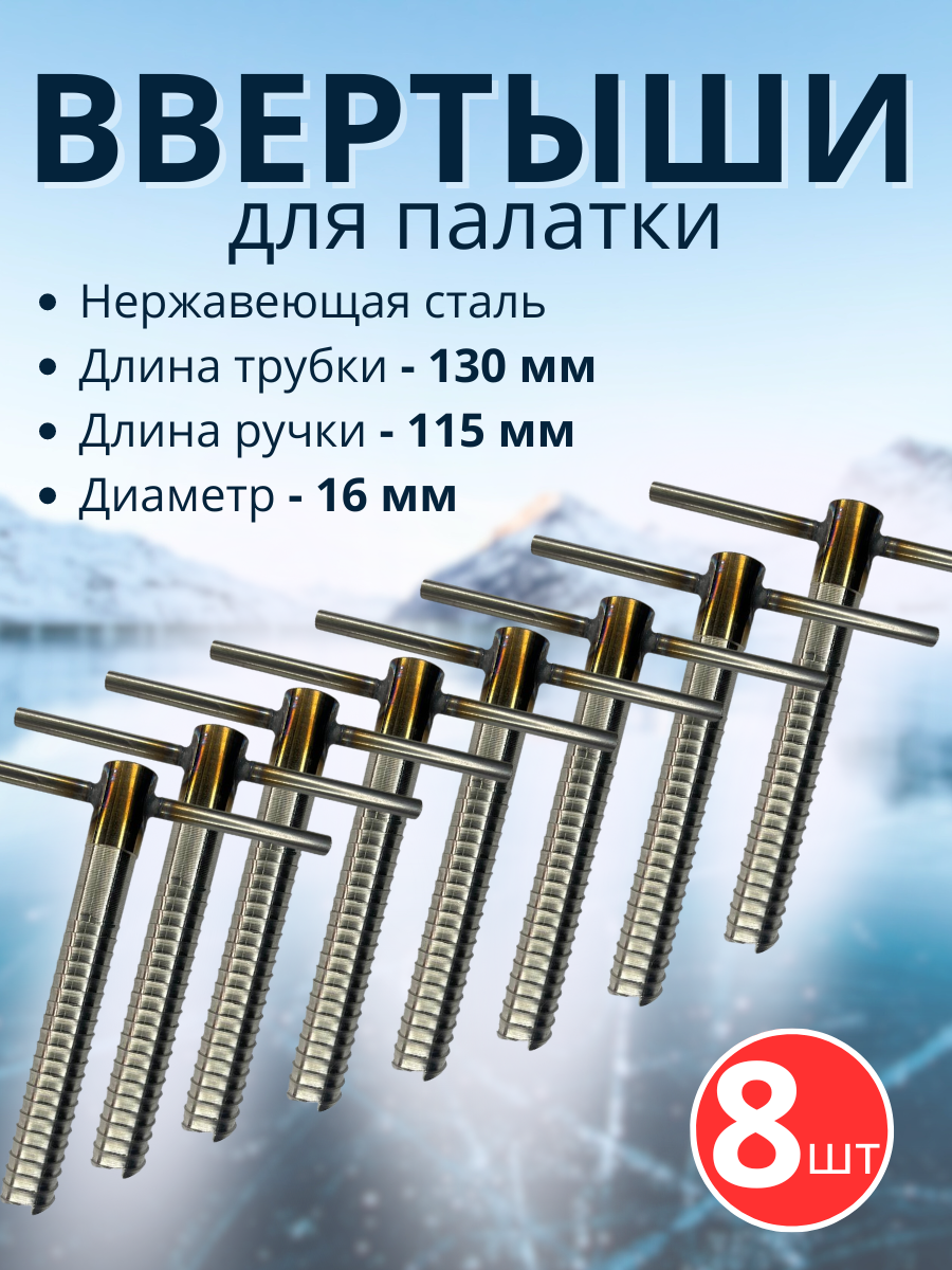 Ввертыши предназначены для крепления зимних палаток на льду. Ввертыш для зимней палатки имеет специальную конструкцию в виде полой трубки с наружной резьбой и острыми зазубринами на конце, которая позволяет с легкостью ввинчивать ввертыш в твердый лед.