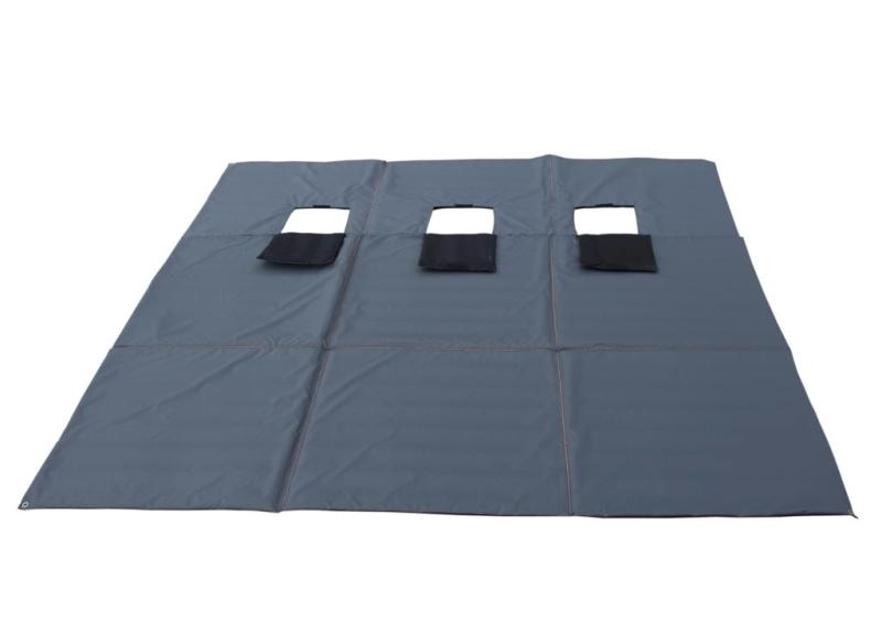 Тёплый пол с тремя отверстиями под лунки, закрывающимися клапанами на липучке, по углам люверсы для крепления. Пол складывается в квадрат, в сложенном виде фиксируется стропой.