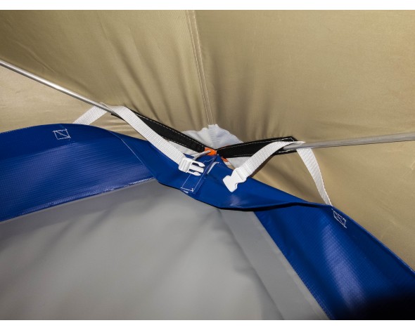 Уникальная система крепления, разработанная компанией Митек, позволяет надежно зафиксировать пол к каркасу палатки при помощи стропы с фастексом. Имеет дополнительные 4 оттяжки для крепления на льду.
