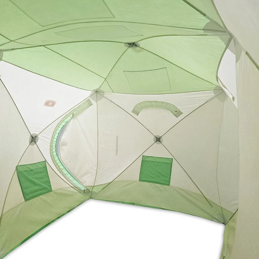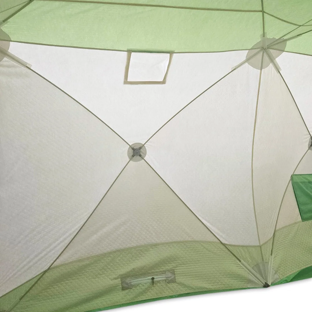 Модель снабжена ветрозащитной юбкой шириной 30 см, окном вентиляции, нижним окном приточки воздуха, двумя окнами на липучке с текстолитовыми вставками под трубу. На стенах и потолке палатки имеются карманы для мелких вещей. К палатке прилагается чехол для переноски и хранения.