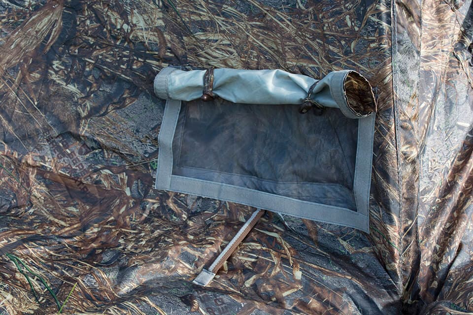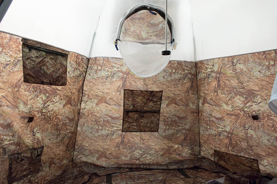 Многофункциональные окна палатки состоят из нескольких слоев: защитный клапан со стороны внешнего тента на липе, внешний тент на молнии, оконное заполнение из прозрачной морозостойкой силиконовой пленки на липе, антимосктиная сетка на молнии. Также с внешней стороны можно установить специальную подпорку.