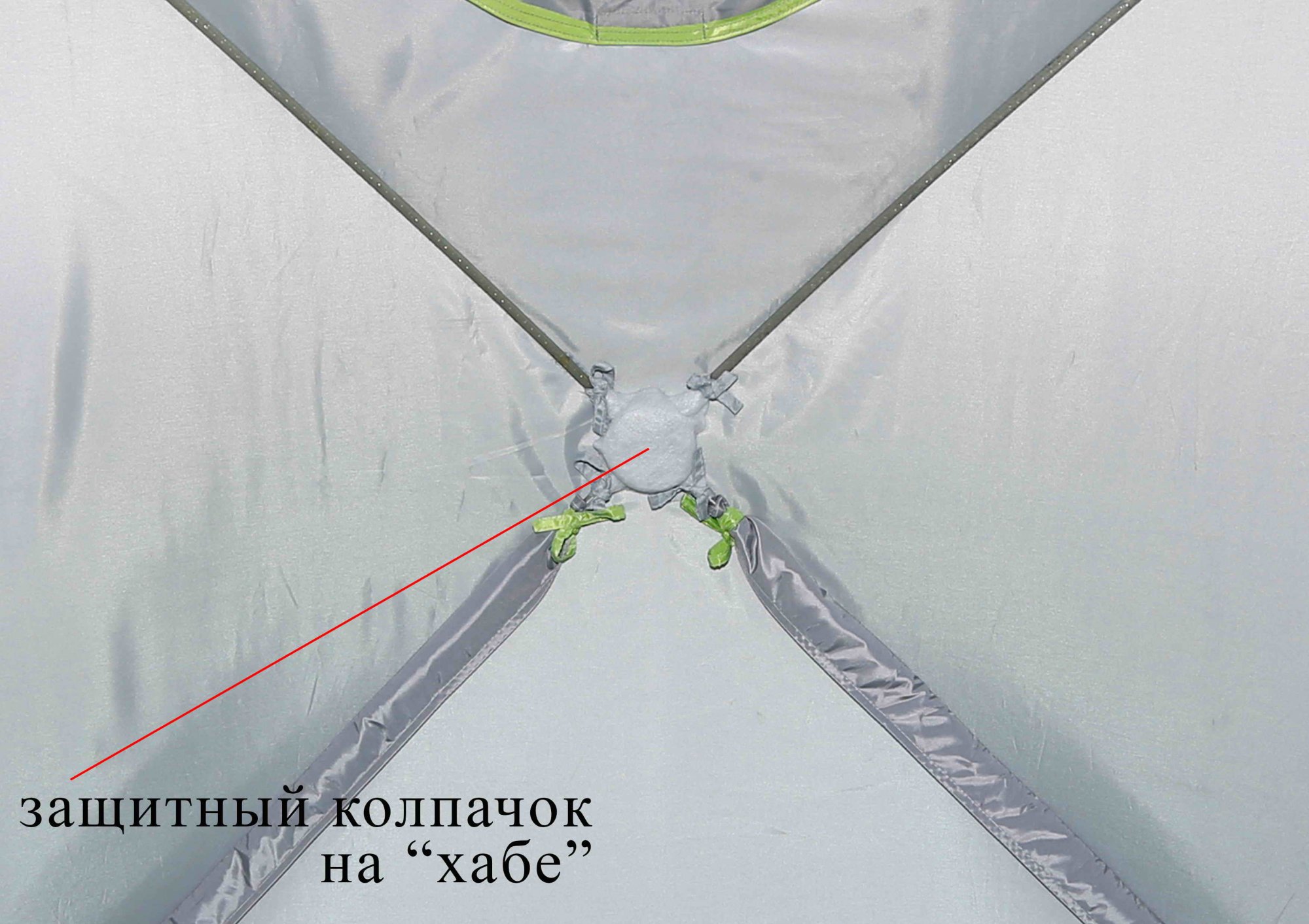 Все пять "хабов" каркаса закрыты с внутренней стороны защитными колпачками. Колпачки на "хабах" изготовлены из мягкого демпферного материала и эффективно защищают тент палатки от повреждения "хабами" каркаса при ее сложении. Также, закрытые колпачками "хабы" не повреждают сумку палатки при транспортировке. Внешняя ветрозащитная юбка оснащена восемью усиленными креплениями для ввертышей.