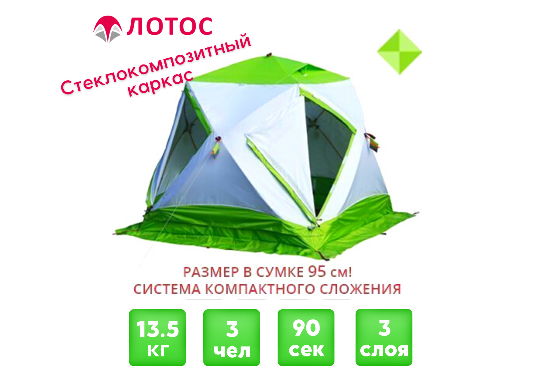 Лотос Куб 3 Компакт Термо – полуавтоматическая палатка куб для зимней рыбалки не имеющая аналогов в категории зимних палаток "куб" по компактности сложения, системе теплоизоляции тента, способу гидроизоляции днища, а также по системе защиты палаточного укрытия от дождя.