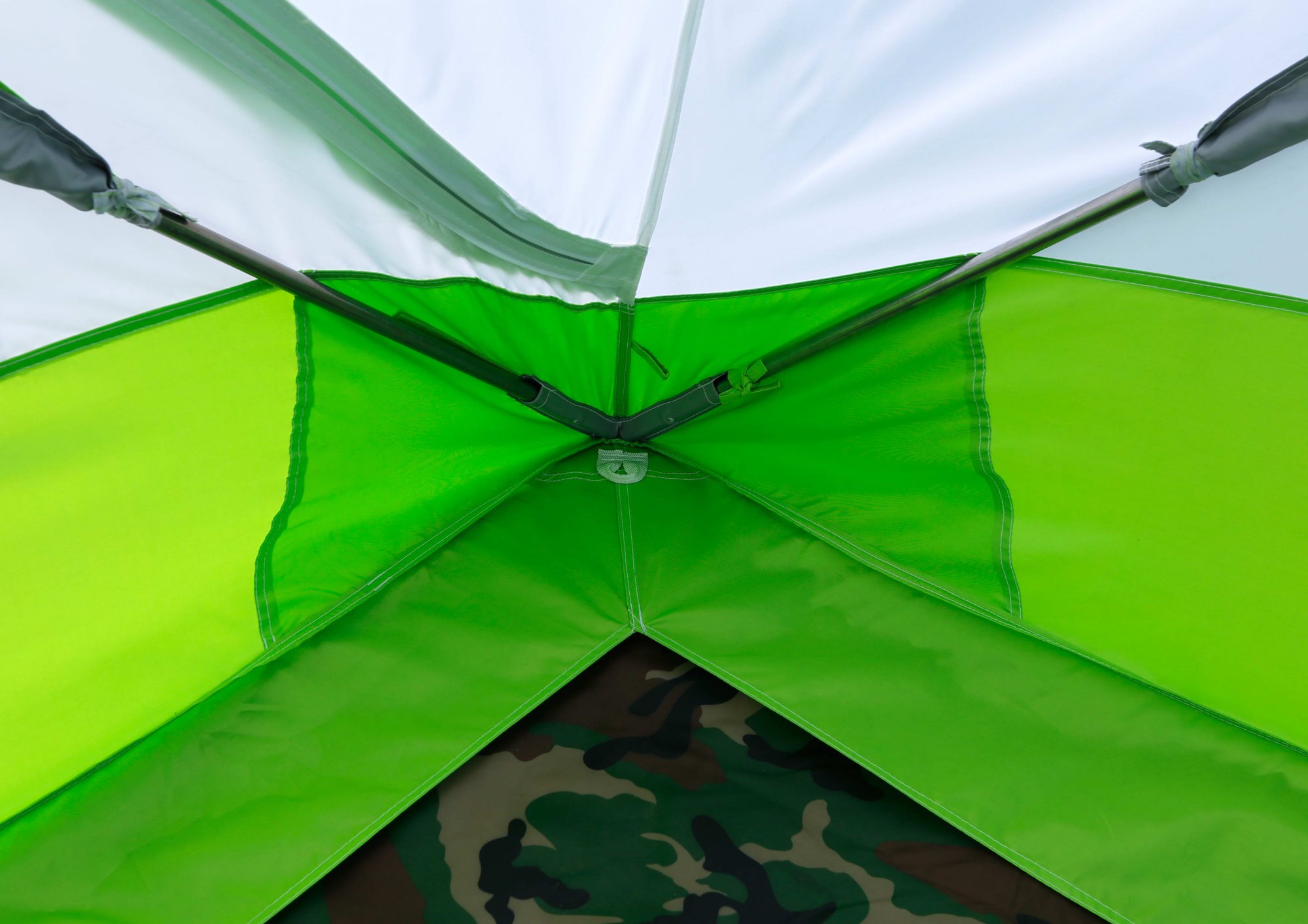 - Стенки палатки расположены внутри «корыта», благодаря чему трехслойный тент защищен от промокания и впитывания влаги между его слоями.