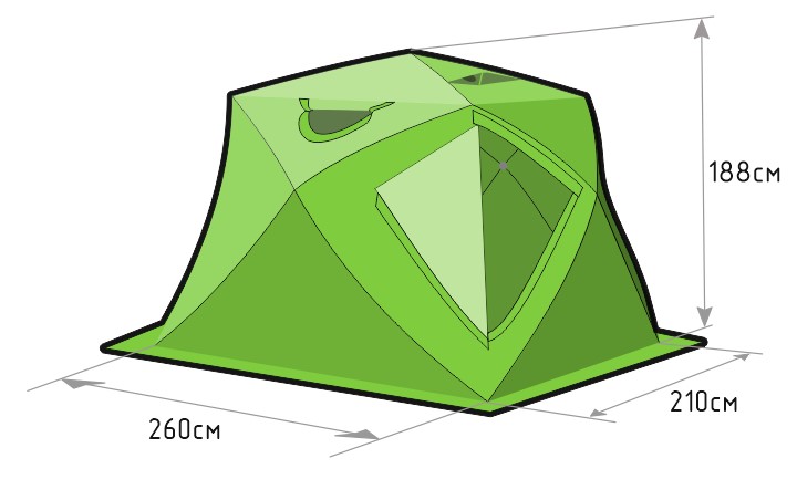 - Оптимальное соотношение пропорций конструкции. Высота палатки 188 см при ширине дна 260 х 210 см;