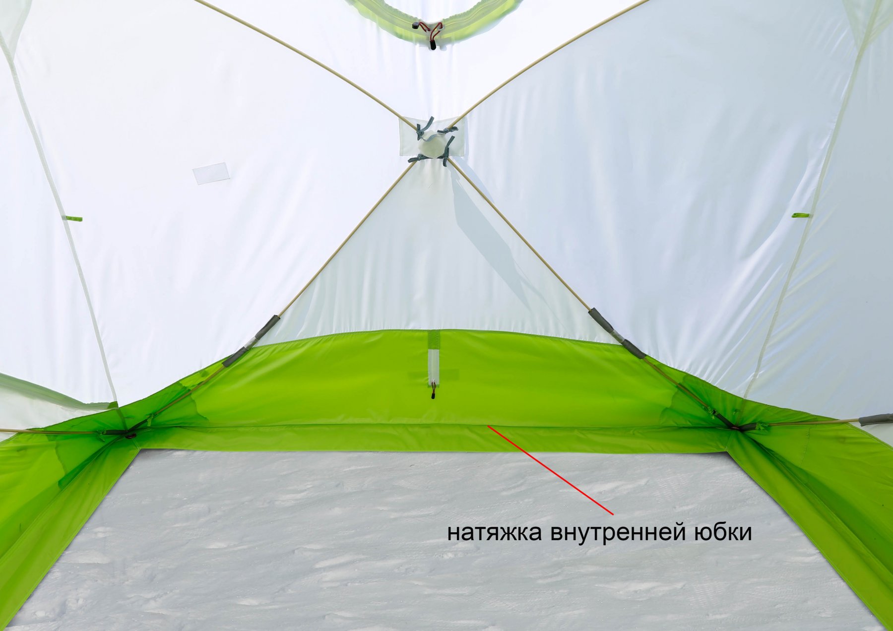Крепление палатки с натяжкой по всем четырем углам именно под юбкой, в местах сочленения дуг, жестко и надежно фиксируют палатку на грунте, обеспечивая лучшую ветроустойчивость, чем аналогичное крепление за саму юбку. Хорошо растянутая по всем четырем углам палатка обеспечивает правильное расположение внешней и внутренней ветрозащитных юбок.