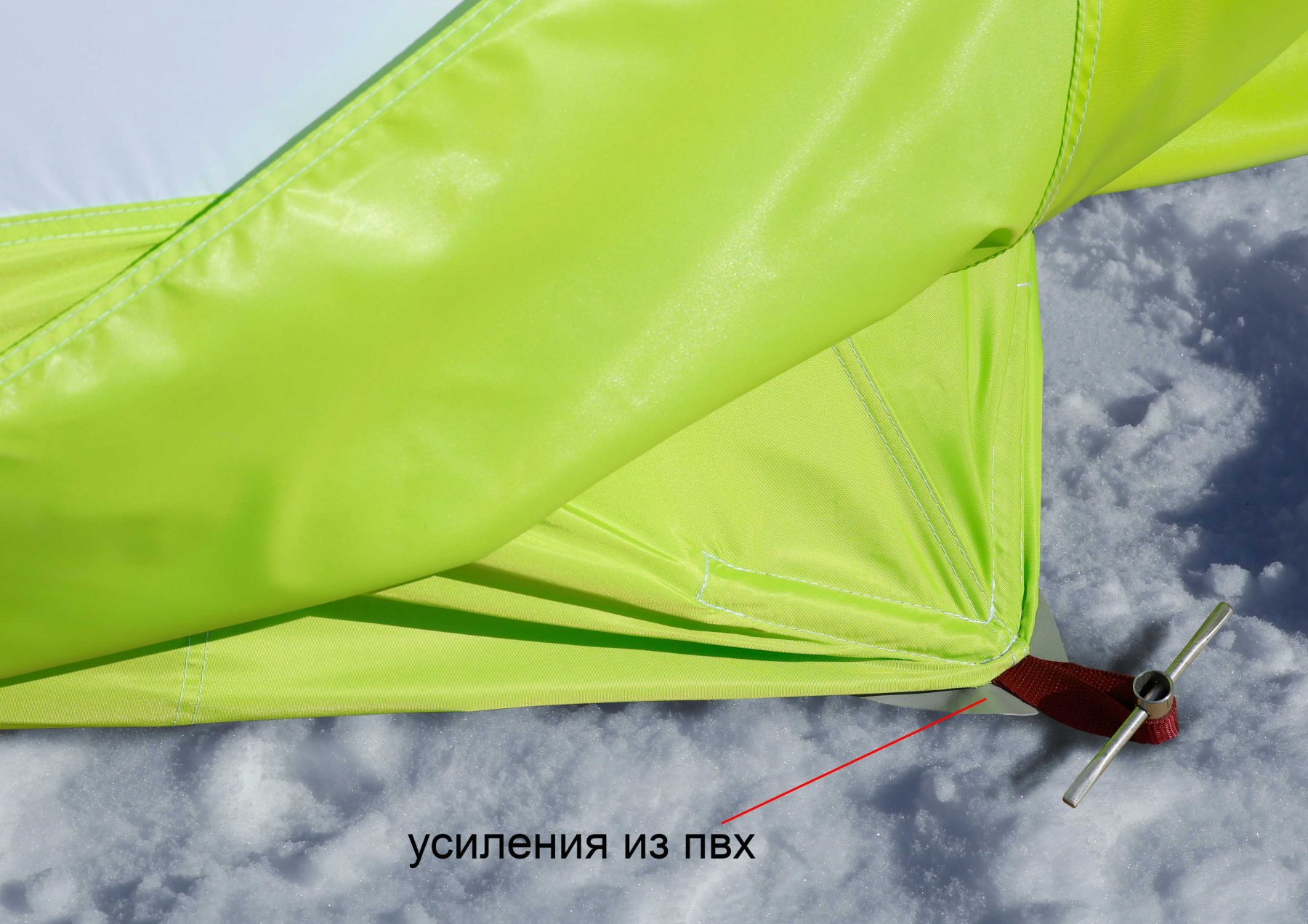 При эксплуатации палатки без гидроизоляционного дна, крепление палатки ко льду (грунту) рекомендуется производить за усиленные петли, расположенные по углам палатки под внешней юбкой.