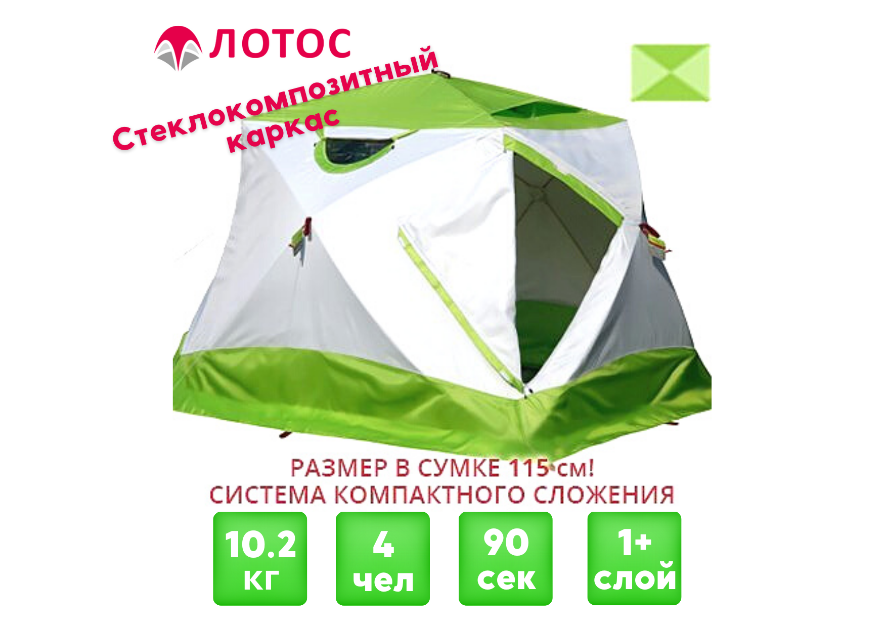 - ЛОТОС Куб 4 Компакт оснащен однослойным тентом (плотность 140 г/м2).