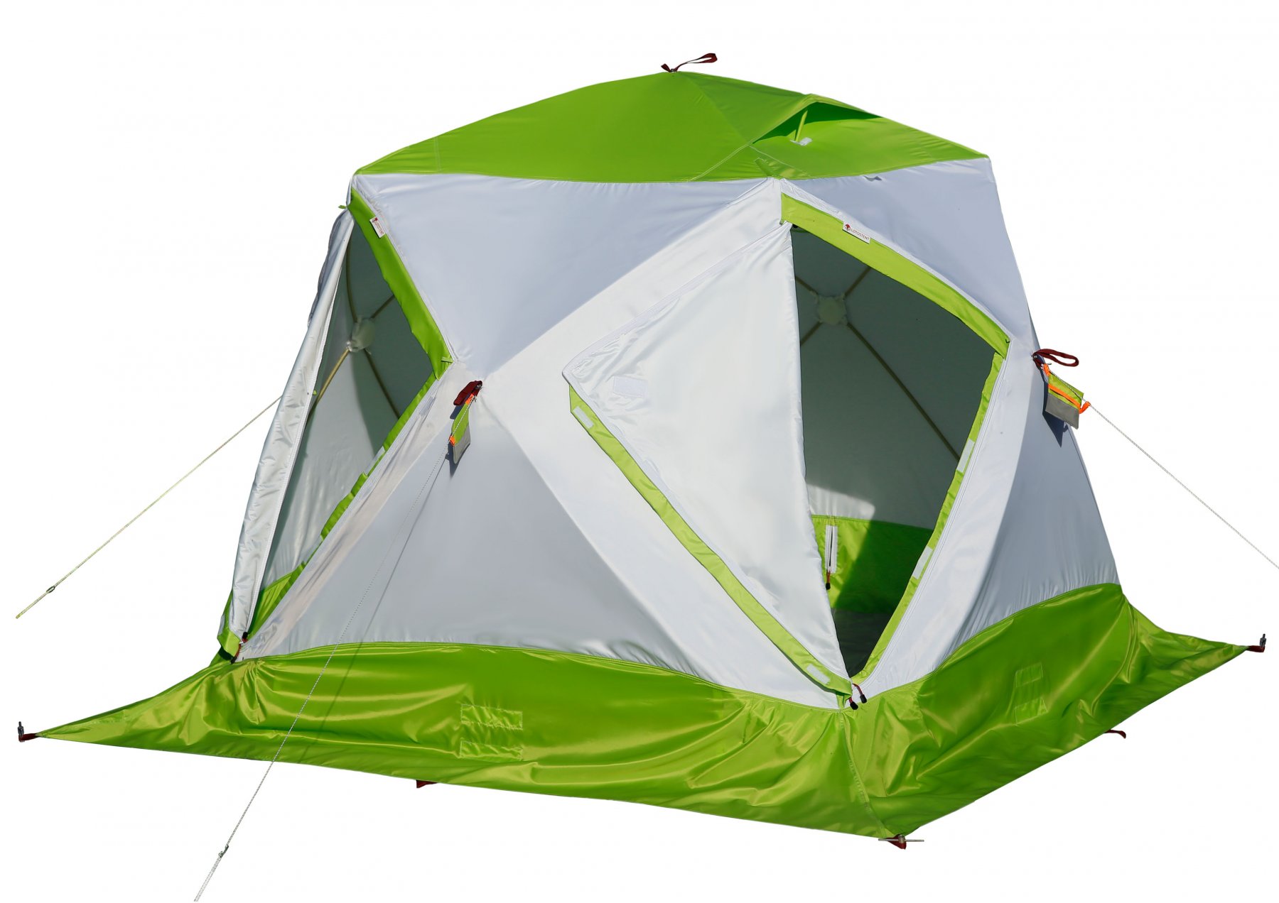 Молнии дверей оснащены защитными утепленными планками на липучках. При этом планки размещены с двух сторон тента, снаружи и изнутри. Планки надежно перекрывают дверную молнию, защищая ее от продувания ветром и обмораживания.