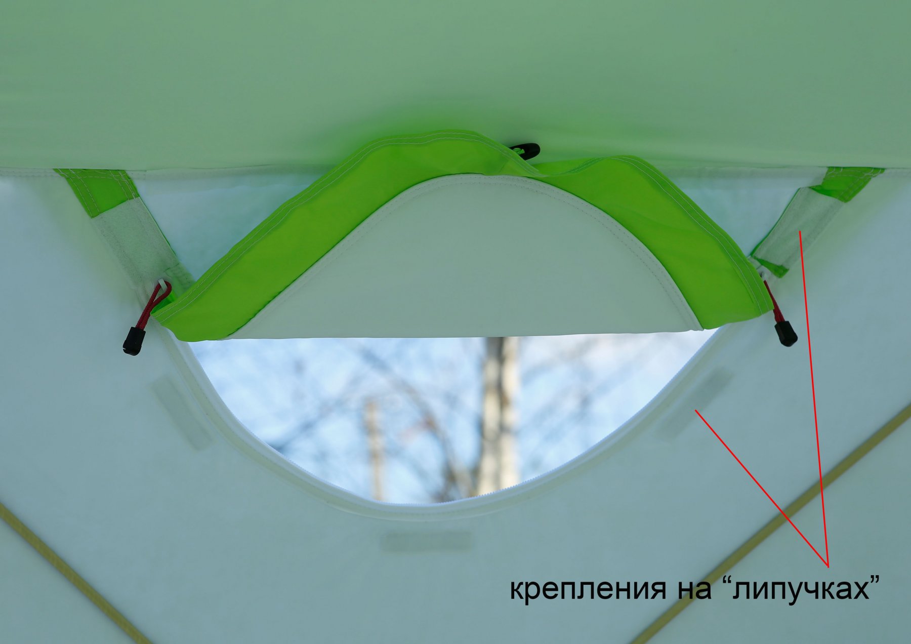 Съемное прозрачное окно изготовлено из высокопрочной морозостойкой полиуретановой пленки толщиной 350 микрон. Окно крепится с внутренней стороны палатки на "липучках" и оснащено внешней защитной планкой, которая обхватывает нижний край оконного проема палатки и крепится на "липучках" снаружи. Система крепления прозрачного окна плотно фиксирует его на тенте, имеет высокую герметичность, надежно защищая оконный проем палатки от продувания ветром и внешних осадков.