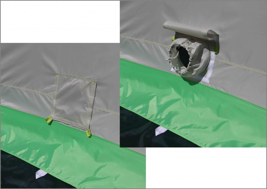 ✔В нижней части палатки расположен приточный клапан для подсоса воздуха. С внешней стороны клапан защищен от попадания осадков открывающимся козырьком. Клапан регулируется высококачественной системой утяжки, позволяющей плотно обжимать установленную в него приточную трубу или производить полное закрытие, гарантируя защиту палатки от продувания.