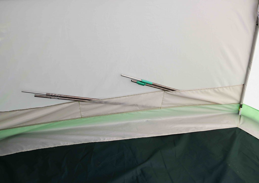 Эффективным методом усиления конструкции зонтичного каркаса является использование распорок (опция). Распорки устанавливаются менее чем за одну минуту на раскрытую палатку поперек основным дугам каркаса, значительно повышая устойчивость палатки и уменьшая до минимума эффект «вдувания стенки» при сильном ветре. Использование распорок упрощает крепление палатки в ветреную погоду. При этом достаточно закрепить палатку растяжками к дугам и не крепить растяжки, установленные на стенках.