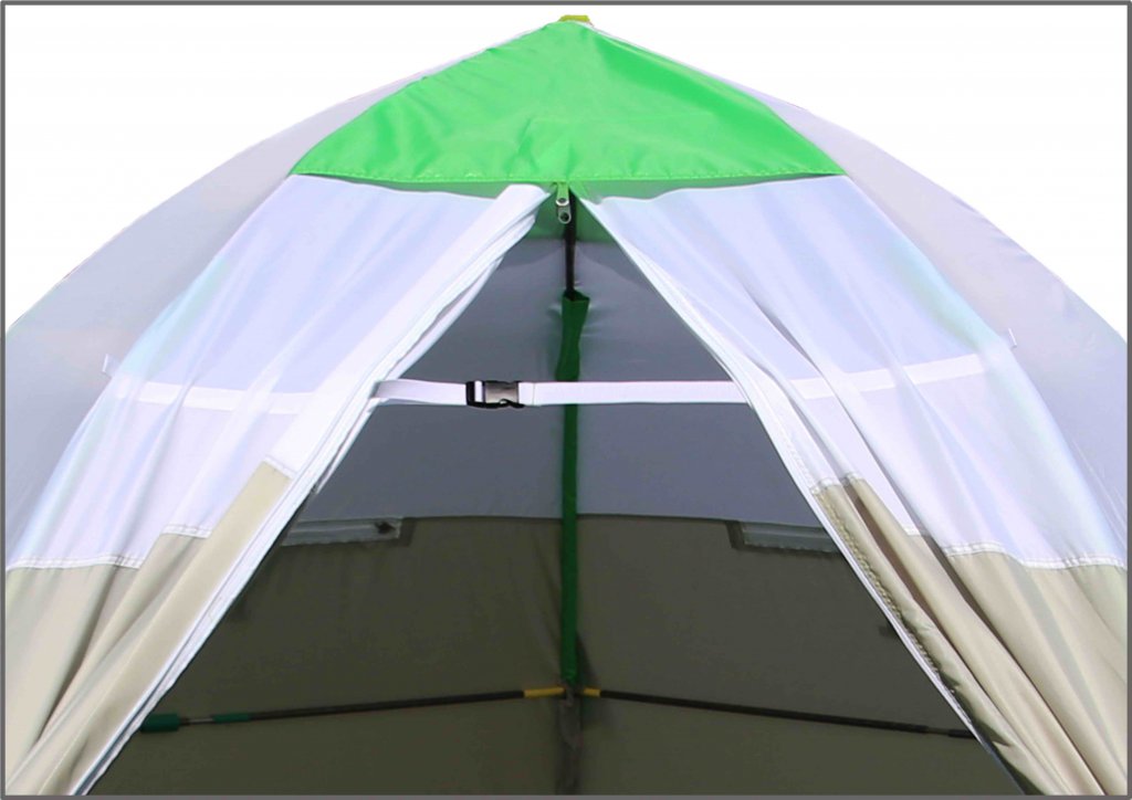 Эксклюзивный запатентованный механизм зонтичного типа в совокупности с жесткими дугами, обеспечивает быстрое и эффективное раскрытие и установку палатки. Опытному пользователю потребуется не более 30 секунд на раскрытие и на складывание палатки в сумку.