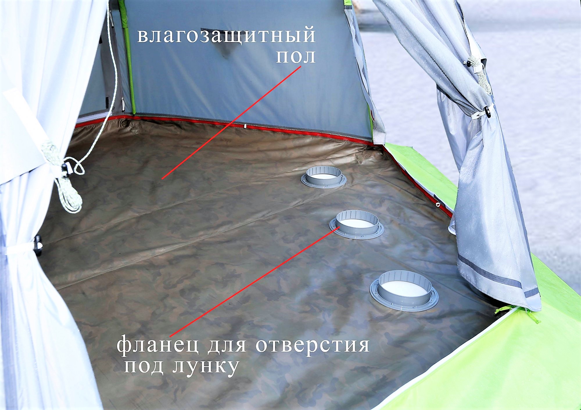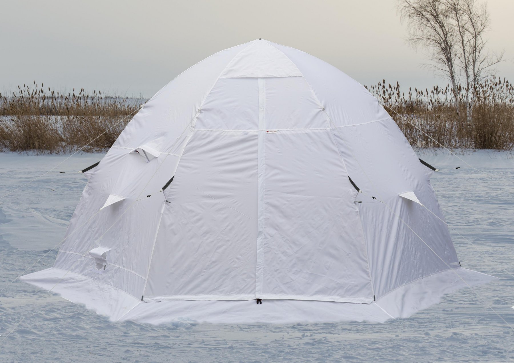 - оснащенность максимально-возможным количеством усиленных креплений для фиксации на льду, что обеспечивает палатке способность выдерживать высокие ветровые нагрузки