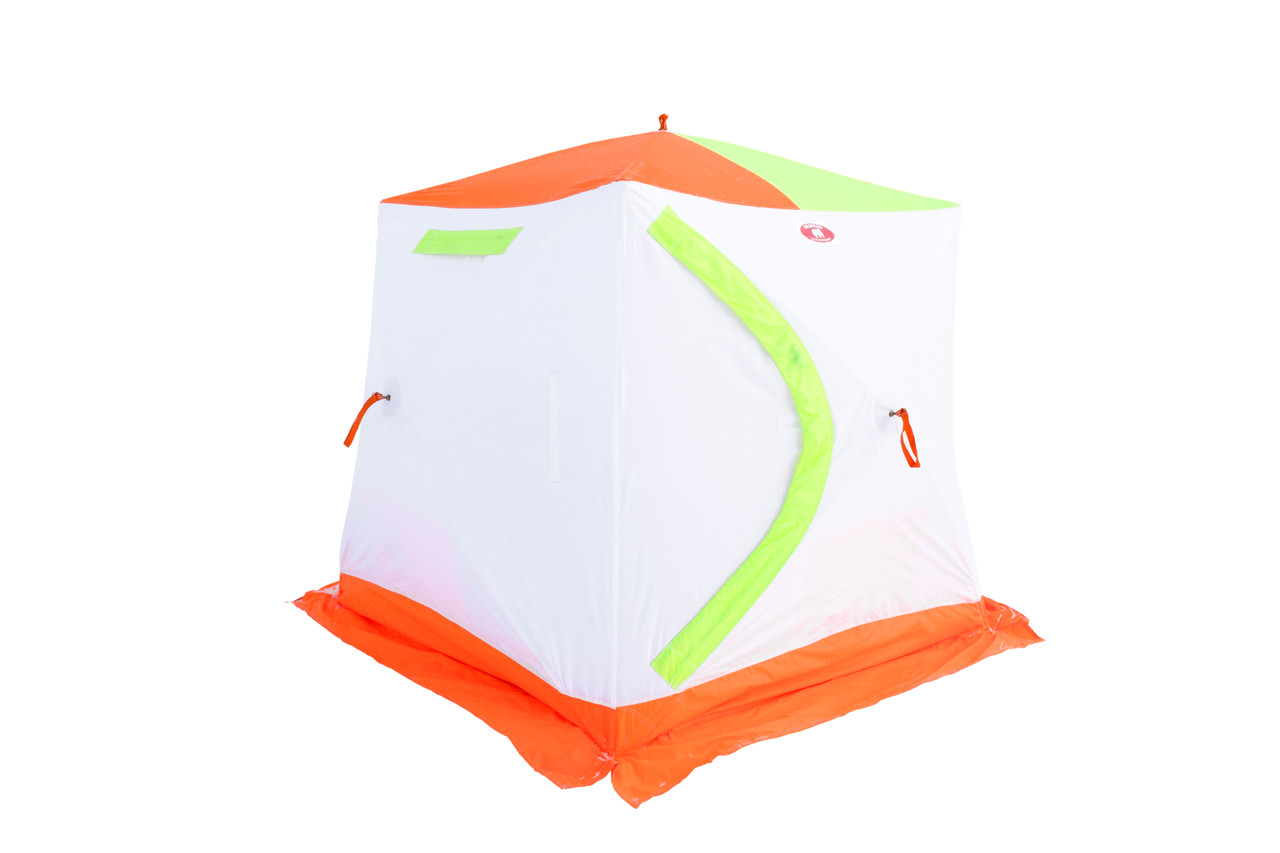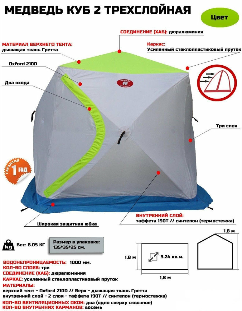 На данный момент палатки Медведь Куб-2 производится в обновленной версии. Из обновлений палатка Куб Медведь приобрела разделку под трубу любого диаметра, также удлиненную внутреннюю стеганную ткань. Вставку из термостойкого материала можно заменить глухим окном из стеганной ткани того же размера. Эта рыболовная зимняя палатка имеет форму куба, что значительно увеличивает внутреннее полезное пространство. У палатки Куб-2, трехслойный тент из дышащих материалов. Палатка имеет два регулируемых окна вентиляции, увеличенную юбку из более плотной и прочной ткани Оксфорд. Верх — смесовая ткань, внутренний слой дышащий — натуральная ткань (габардин) и между ними не толстый слой синтепона. Очень простая в установке, не требует дополнительных навыков. Имеет два входа, расположенных по диагонали, что очень удобно. Очень теплая, дышащая палатка для рыбалки Куб, сделает зимнюю рыбалку комфортной в любые холода. Модель снабжена ветро/снегозащитной юбкой (20 см), двумя окнами для вентиляции, окном на липучке с дополнительной вставкой под трубу, нижним окном приточки воздуха, и 8 внутренними карманами (по 4 кармана с двух сторон). К палатке прилагается чехол для переноски и хранения.