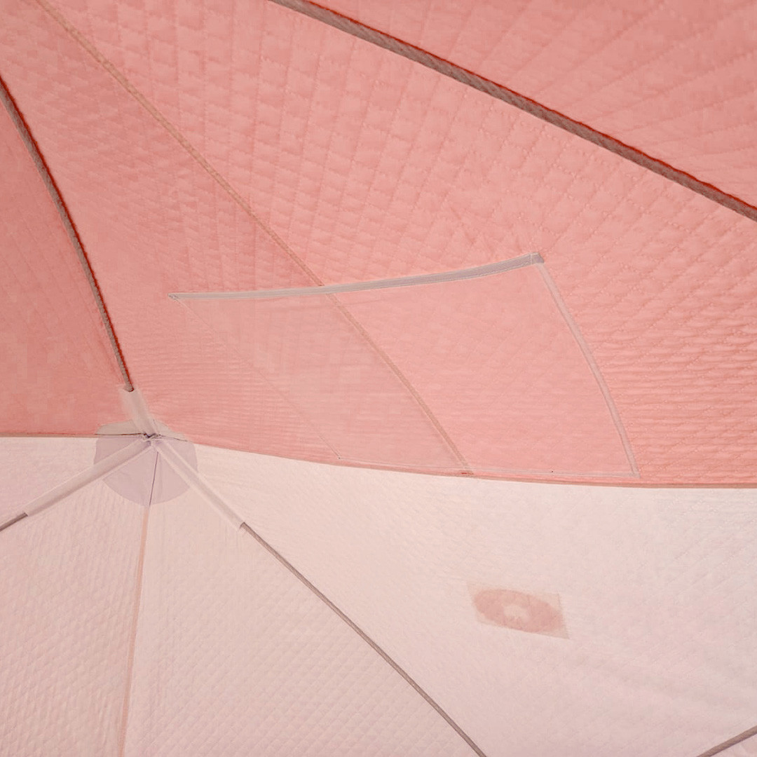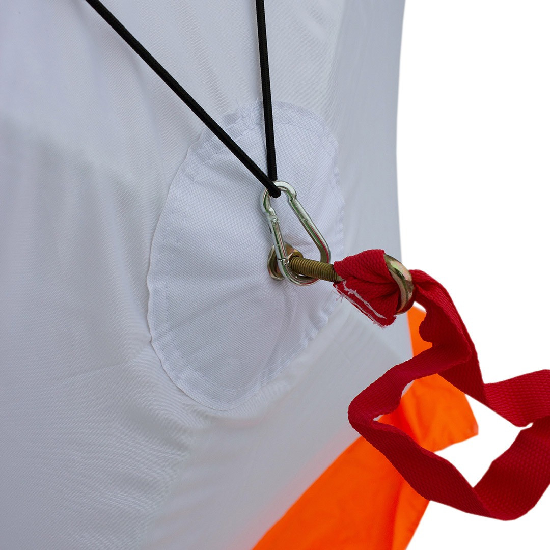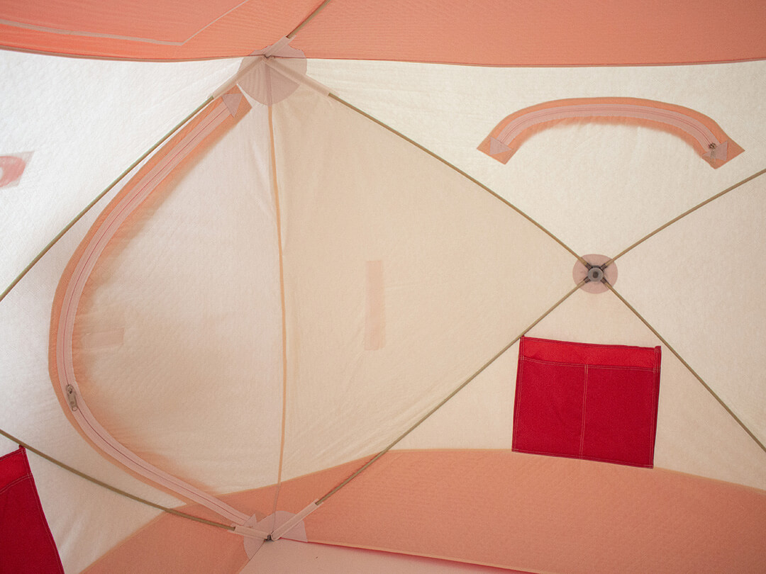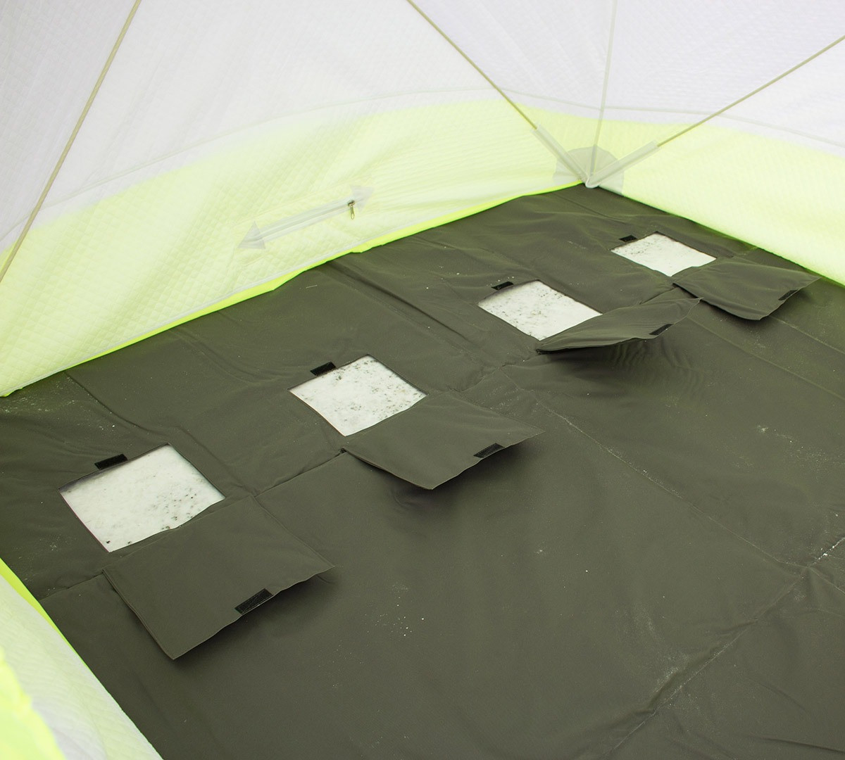 Трёхслойная конструкция с утеплителем значительно снижает теплопотери и защищает от ветра. Палатка подходит для установки источников обогрева — в крыше предусмотрен специальный узел для безопасного вывода дымохода.